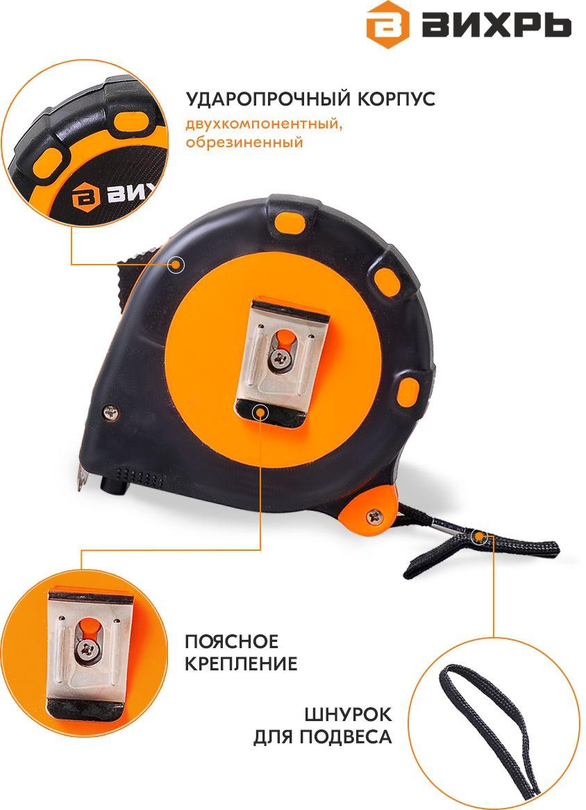 - Описание: Рулетка измерительная ВИХРЬ 5 м х 19 мм предназначена для измерения размеров и расстояний. Корпус рулетки двухкомпонентный. Выполнен из ударопрочной пластмассы, частично обрезинен и имеет эргономичную форму.