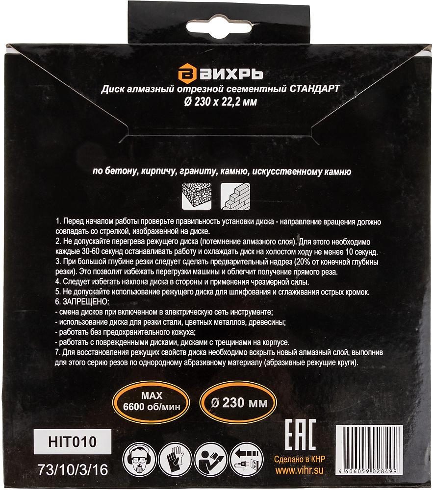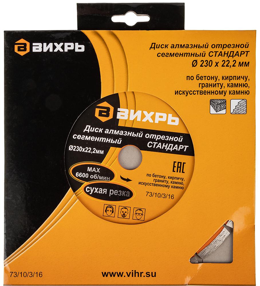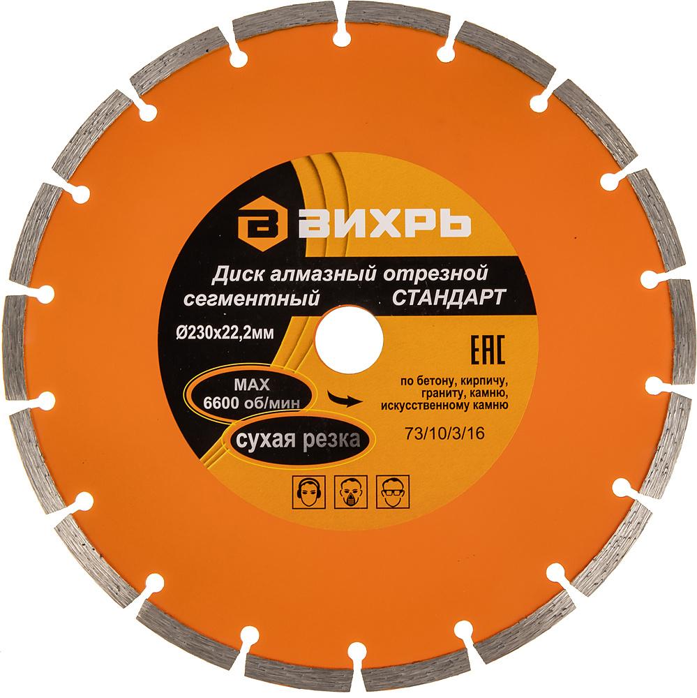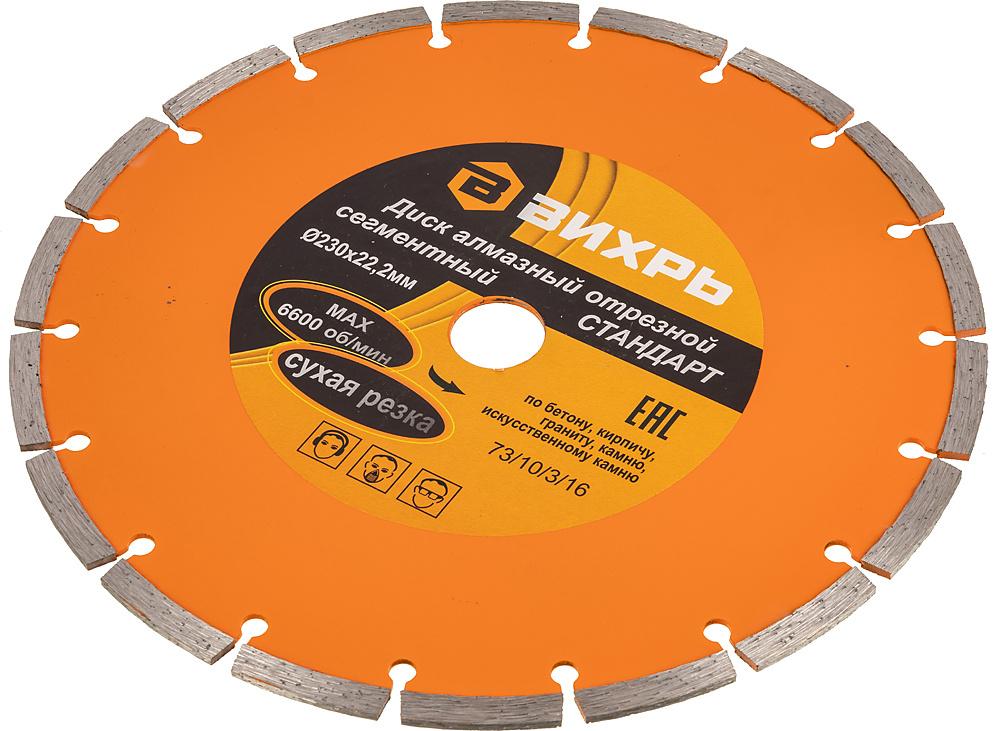 - Описание: Диск алмазный отрезной сегментный СТАНДАРТ, 230 х 22,2 мм, сухая резка Вихрь - это алмазный отрезной диск, который используется совместно с угловыми шлифмашинами (болгарками) для сухой резки гранитных, бетонных, кирпичных и каменных изделий.