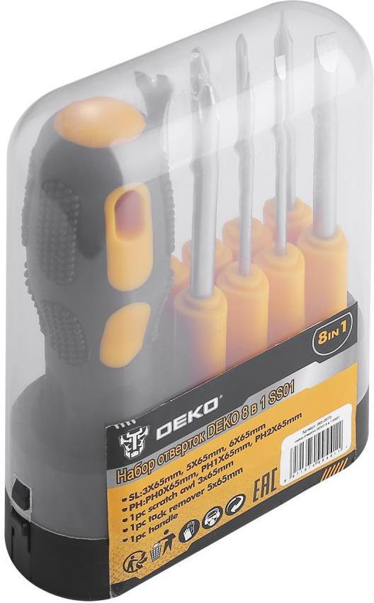 - Описание: Набор отверток DEKO 8 в 1 SS01 включает в себя: 3 шт. Slotted:3х65,5х65,6х65 мм., 3 шт Phillips:PH0х65,PH1х65,PH2х65 мм., чертилка 3х65 мм., гвоздодер для гвоздей и кнопок 5х65 мм., рукоятка.