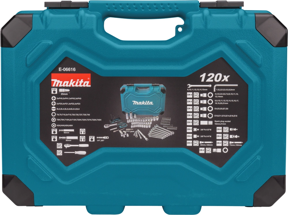 - Описание: Набор инструментов Makita E-06616 является универсальным комплектом, который будет незаменим в быту, в гараже, но даже, позволяя выполнять широкий спектр работ.