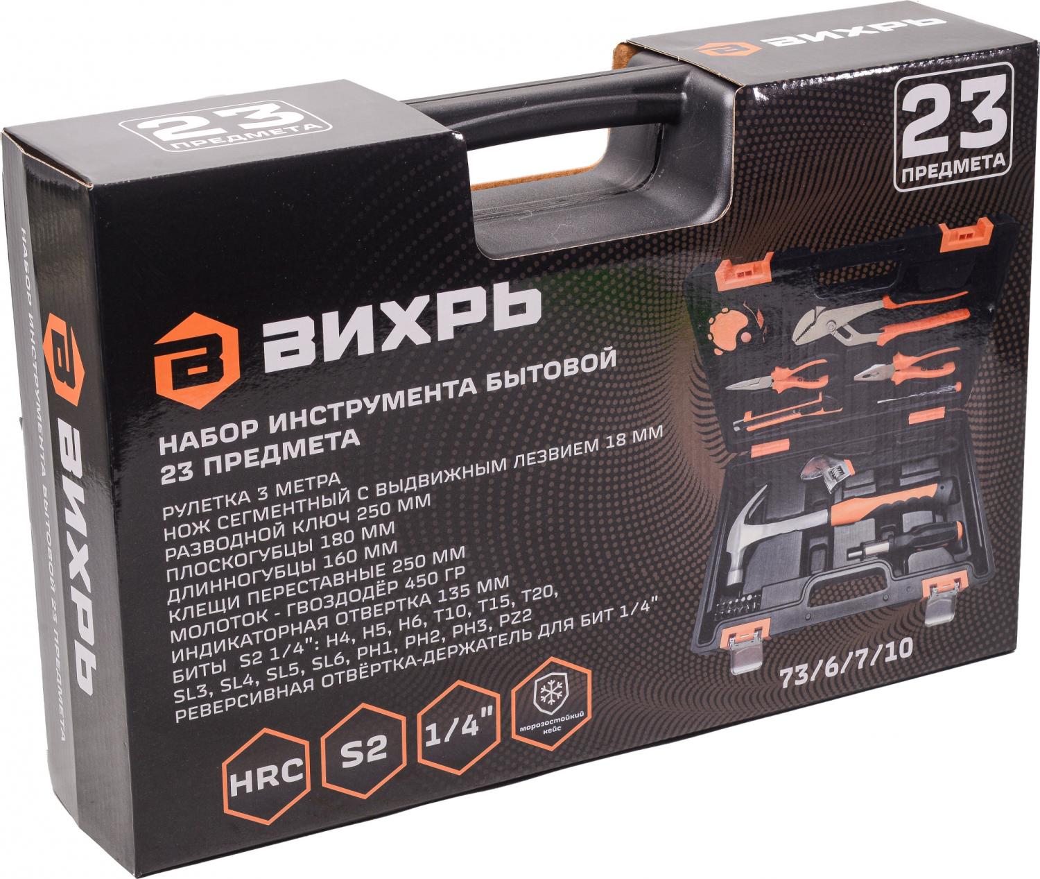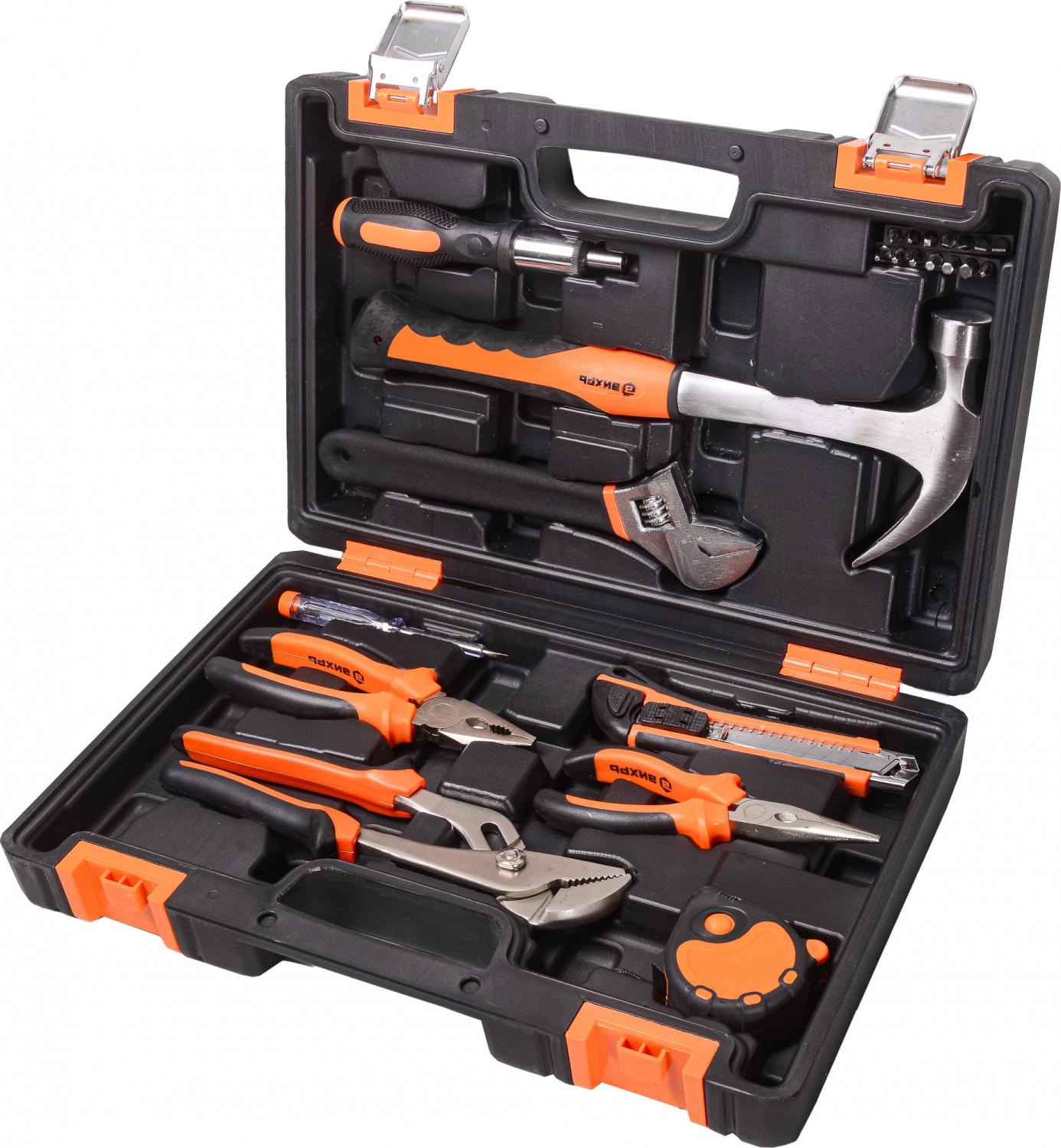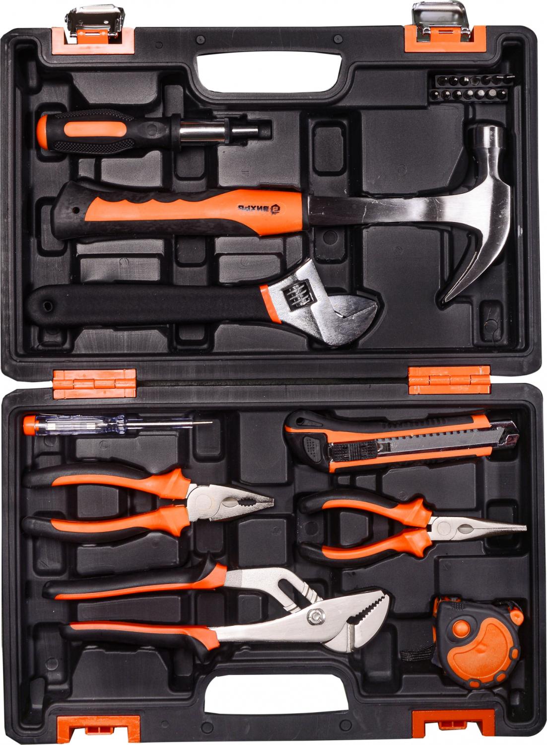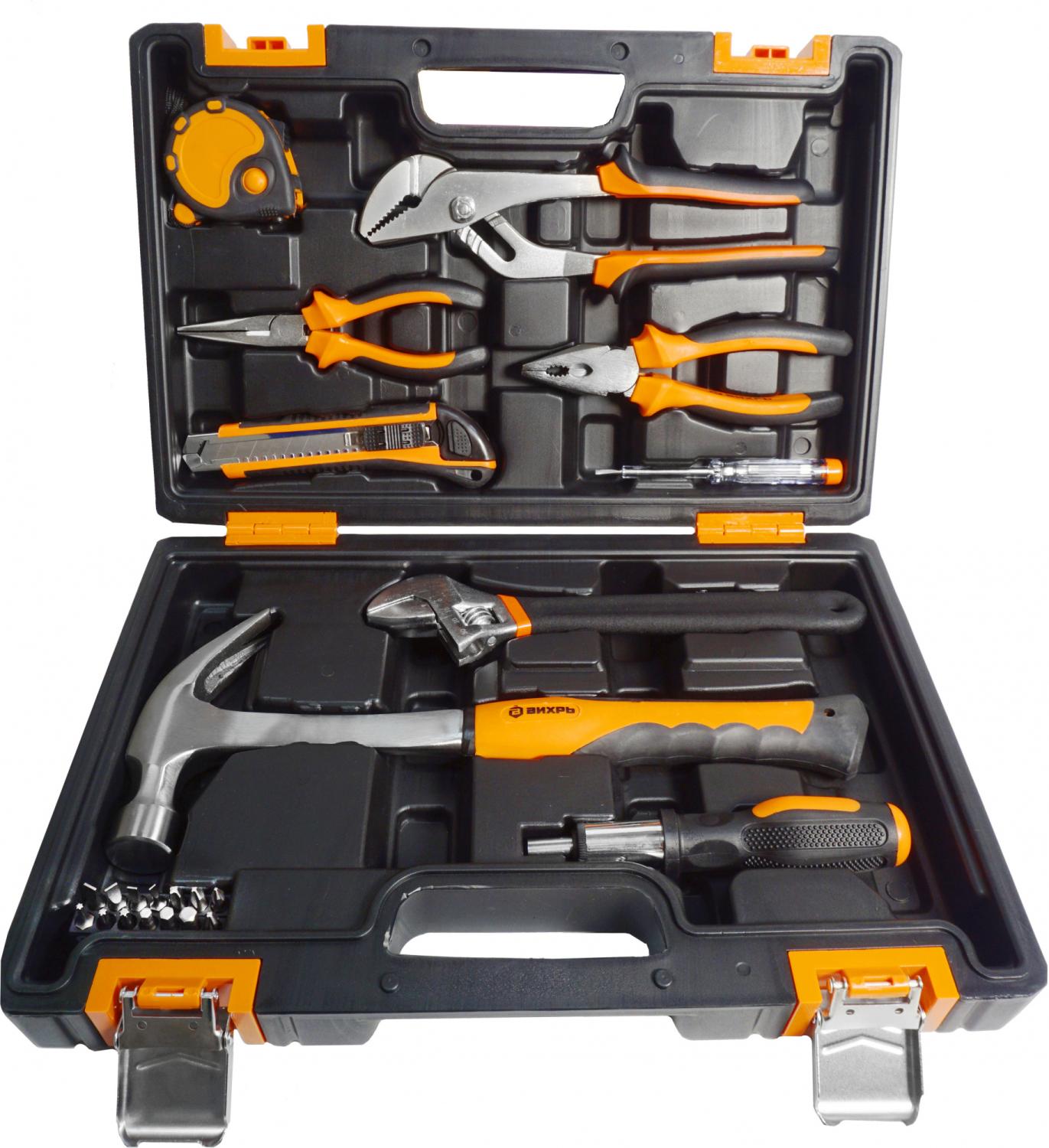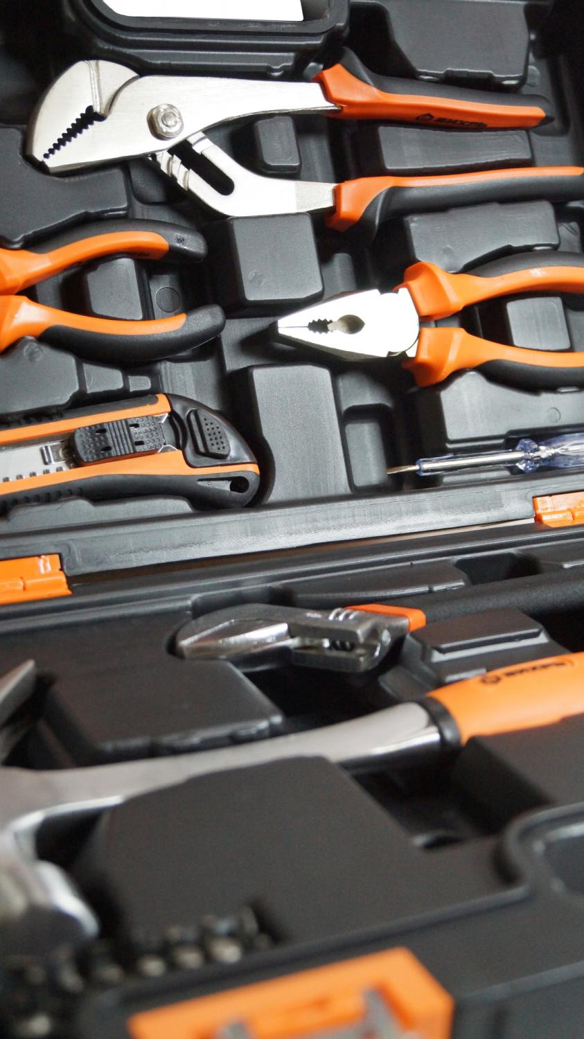 - Другие инструменты/принадлежности: Длинногубцы 160 мм., плоскогубцы 180 мм., нож сегментный с выдвижным лезвием 18 мм., реверсивная отвертка-держатель для бит 1/4, индикаторная отвертка 135 мм., клещи переставные 250 мм. и биты S2 1/4": H4, H5, H6, T10, T15, T20, SL3, SL4, SL5, SL6, PH1, PH2, PH3, PZ2.