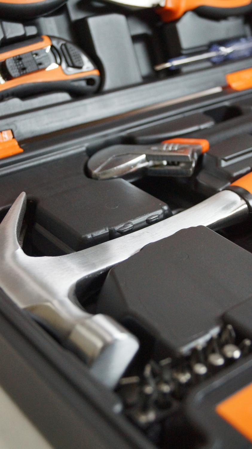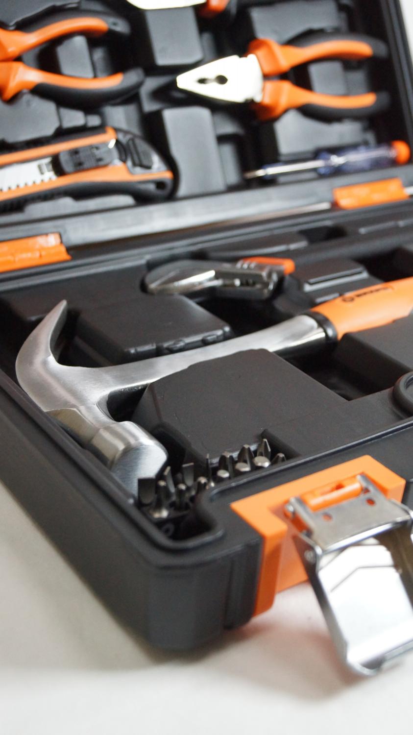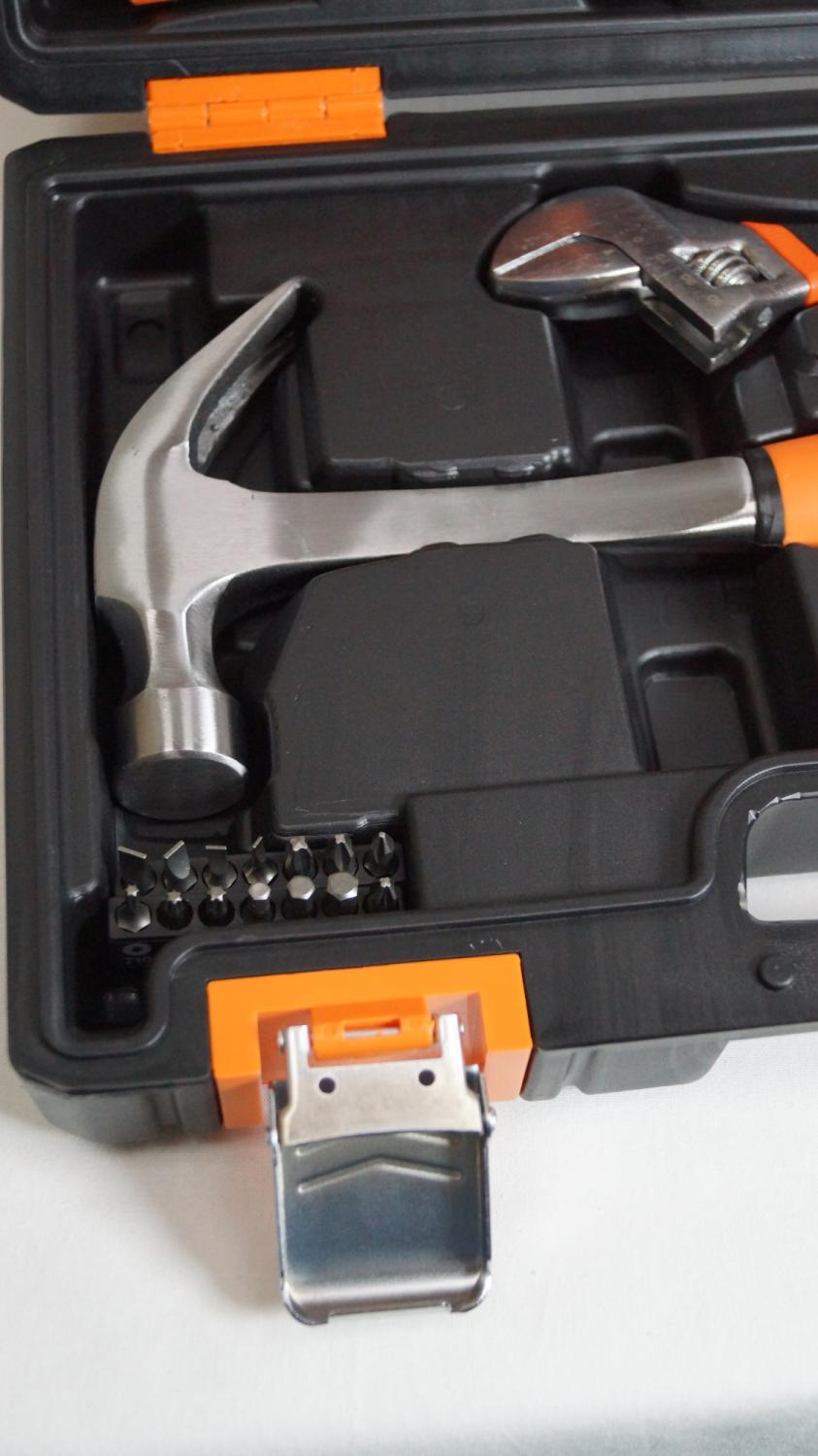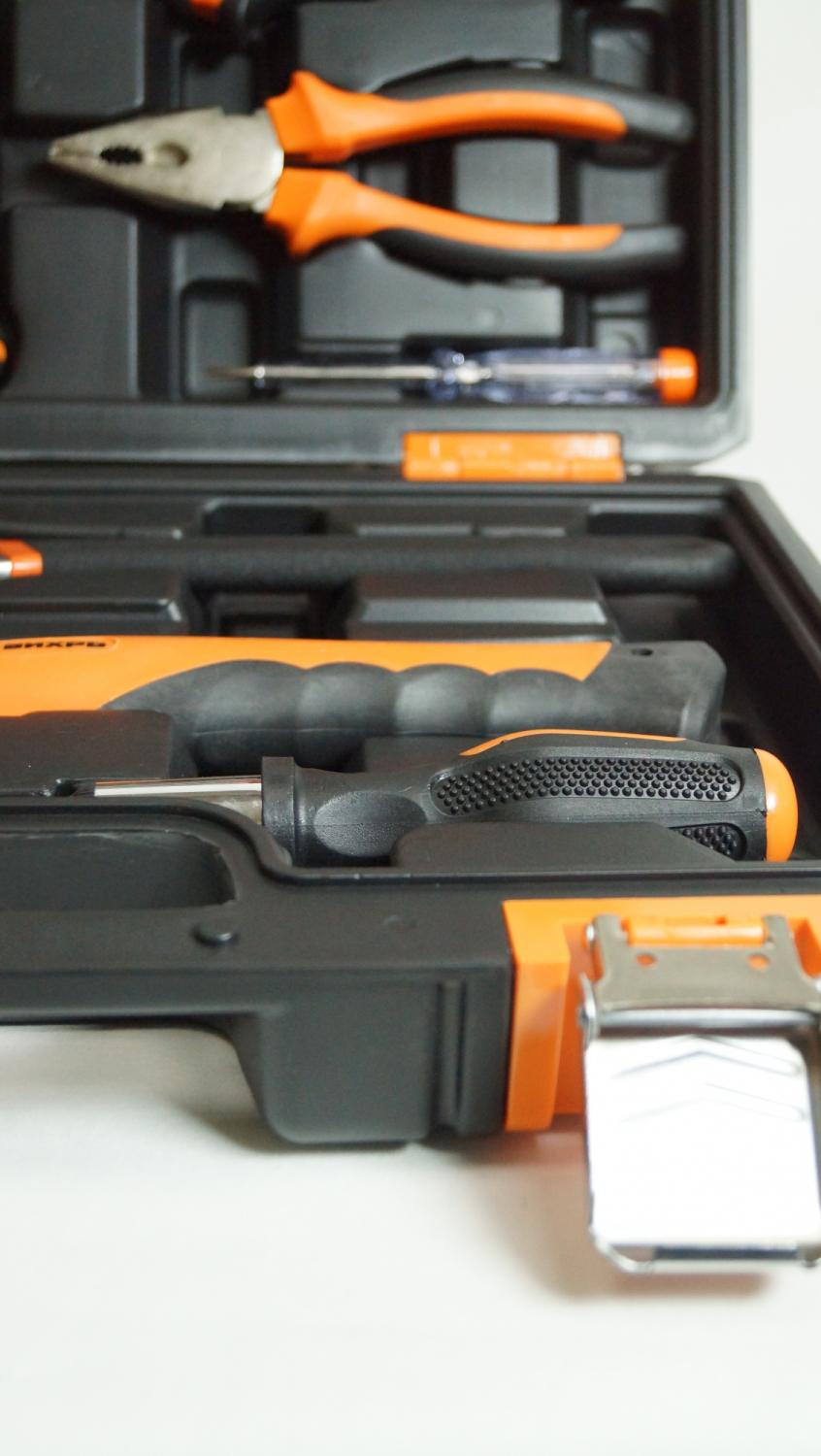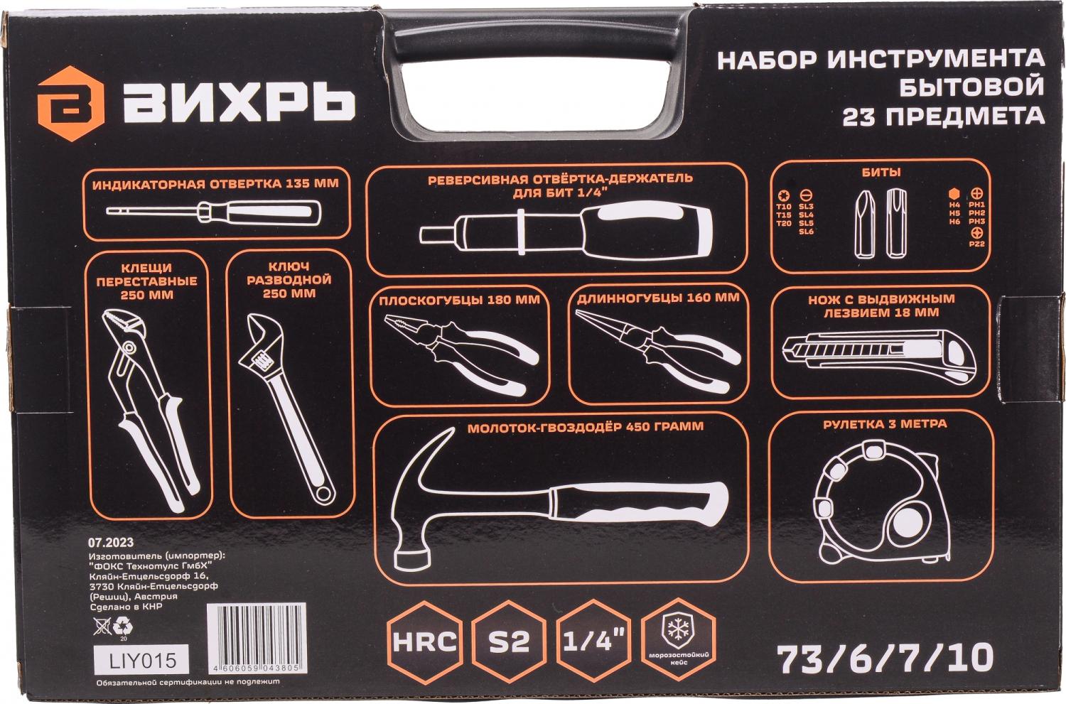 - Другие инструменты/принадлежности: Длинногубцы 160 мм., плоскогубцы 180 мм., нож сегментный с выдвижным лезвием 18 мм., реверсивная отвертка-держатель для бит 1/4, индикаторная отвертка 135 мм., клещи переставные 250 мм. и биты S2 1/4": H4, H5, H6, T10, T15, T20, SL3, SL4, SL5, SL6, PH1, PH2, PH3, PZ2.