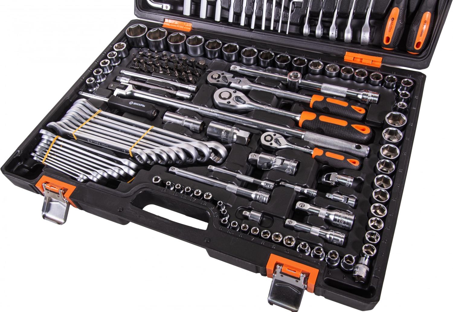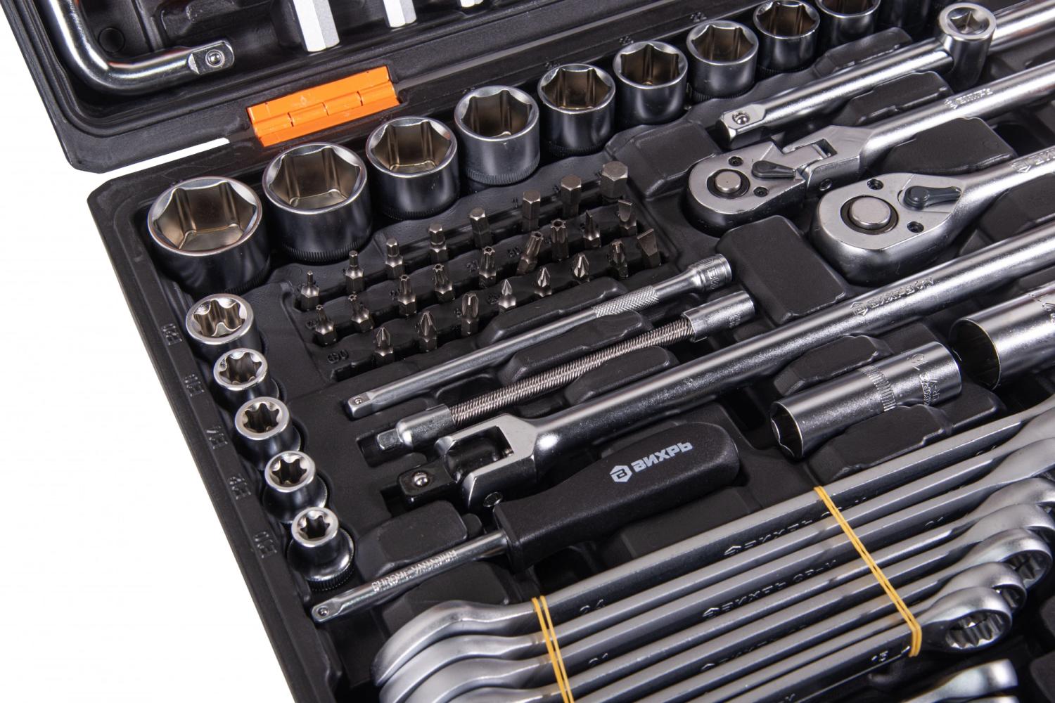 - Дополнительно в наборе, 1/4"DR: Удлинители 50, 100, 150 мм. адаптер для бит, вороток Т-образный, карданный шарнир, отвертка-держатель, трещотка