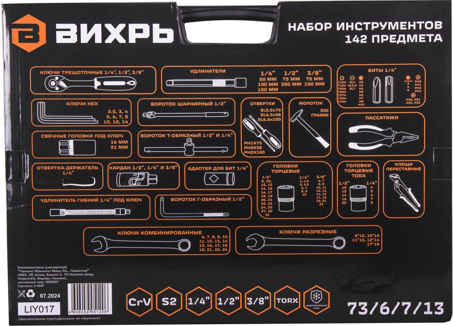 - Дополнительно в наборе, 1/2"DR: Удлинители 75, 250 мм вороток Г-образный, вороток Т-образный, вороток шарнирный, карданный шарнир, трещотка.