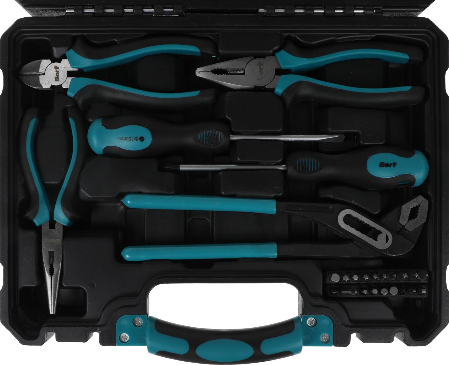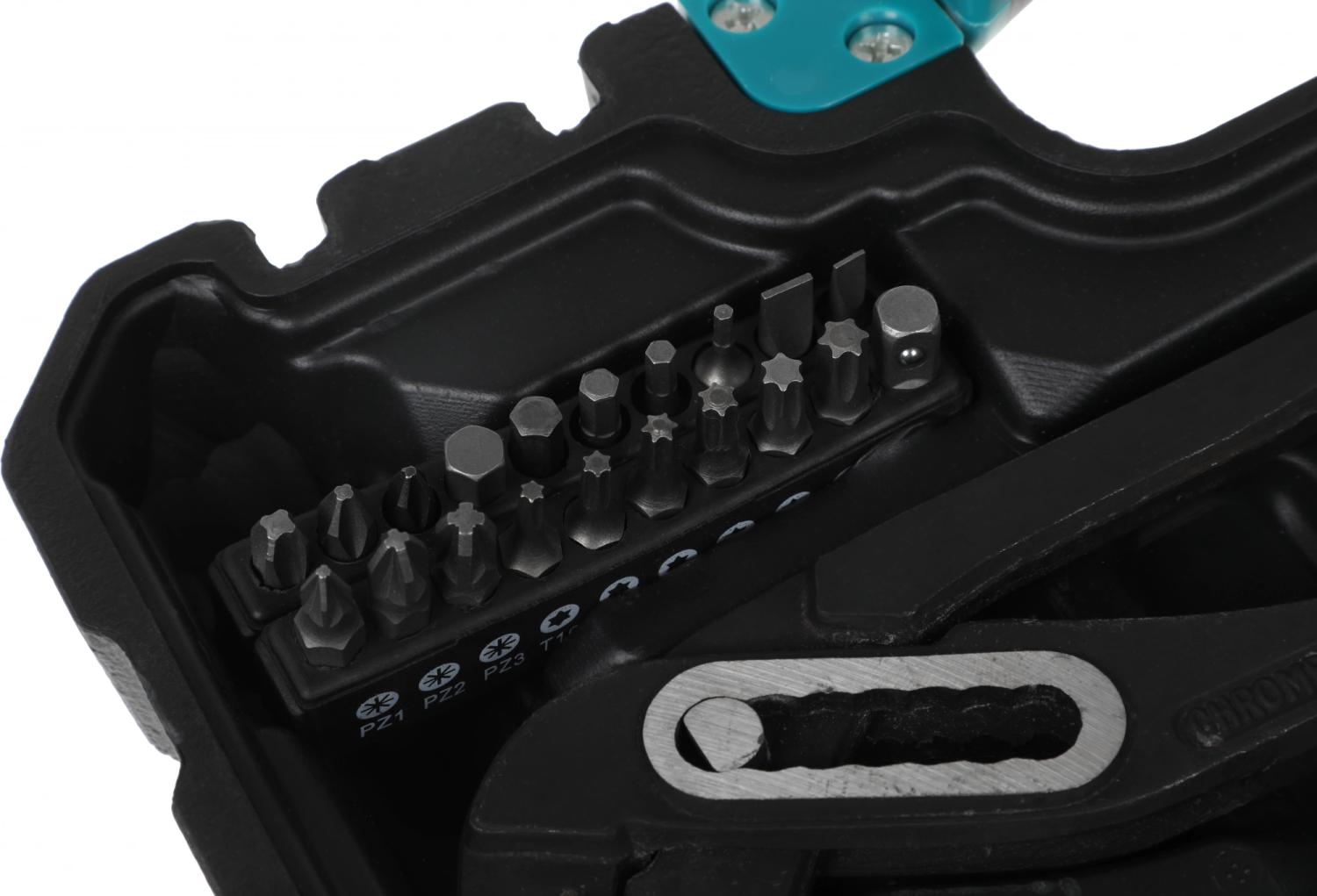 - Комплектация: жесткий кейс, набор бит, набор гаечных ключей, набор головок, набор отверток
