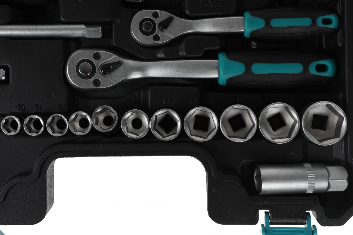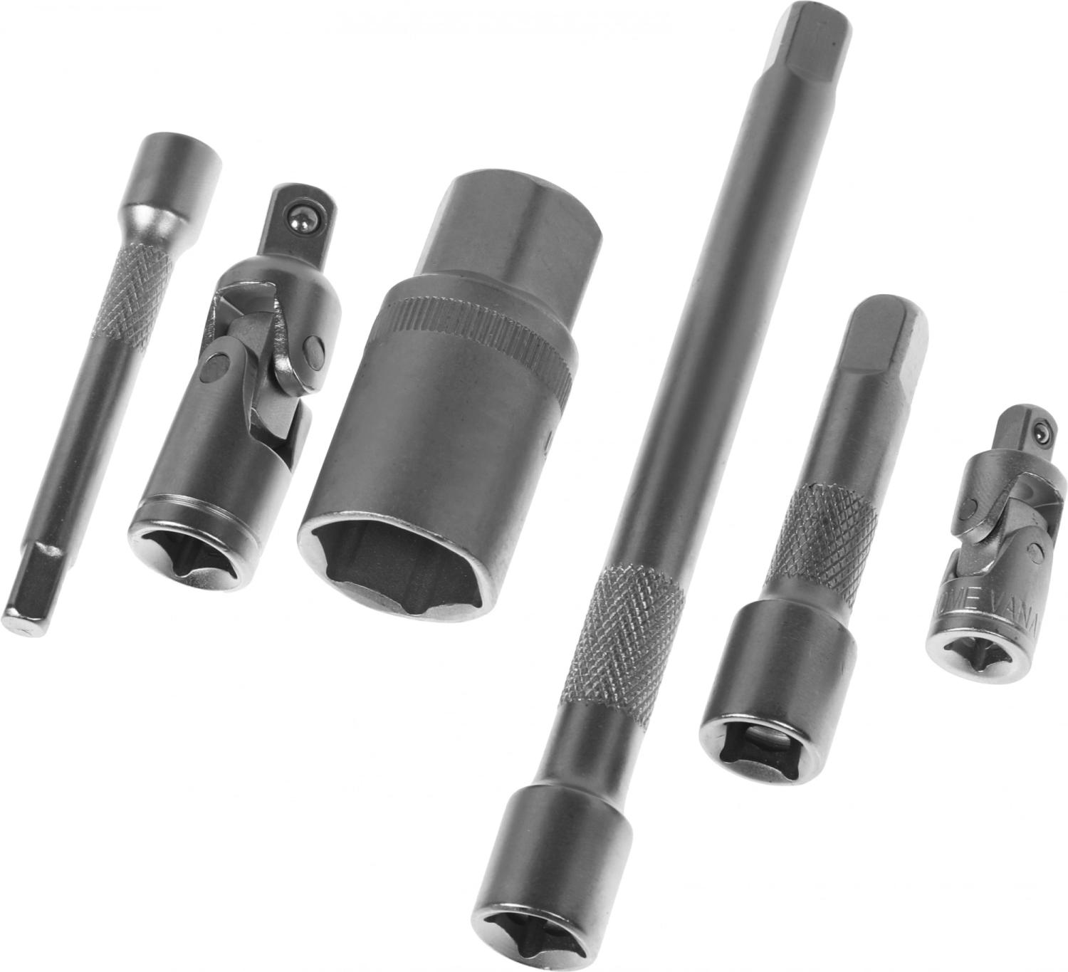 - Дополнительно в наборе, 3/8"DR: Удлинители - 75, 150 мм Адаптер, карданный шарнир, трещотка
