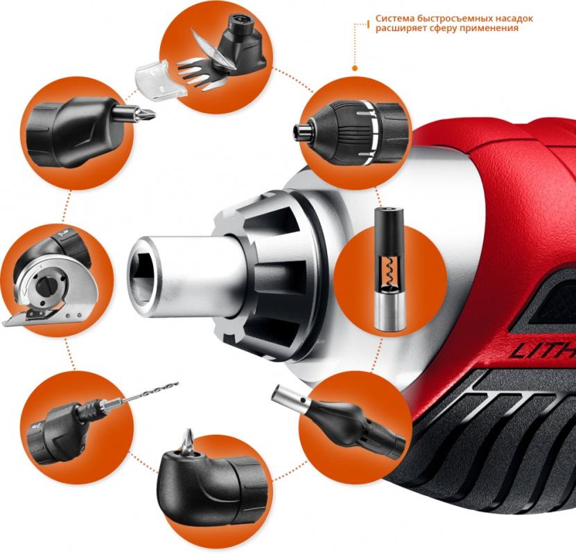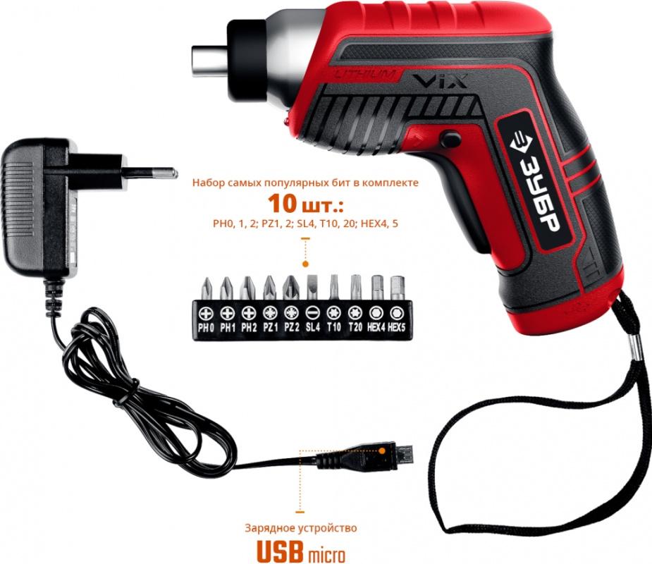 - Комплект поставки: Отвертка; Зарядное устройство; Биты 25 мм (10 PH0, PH1, PH2, PZ1, PZ2, S4, T10, T20, HEX4, HEX5)