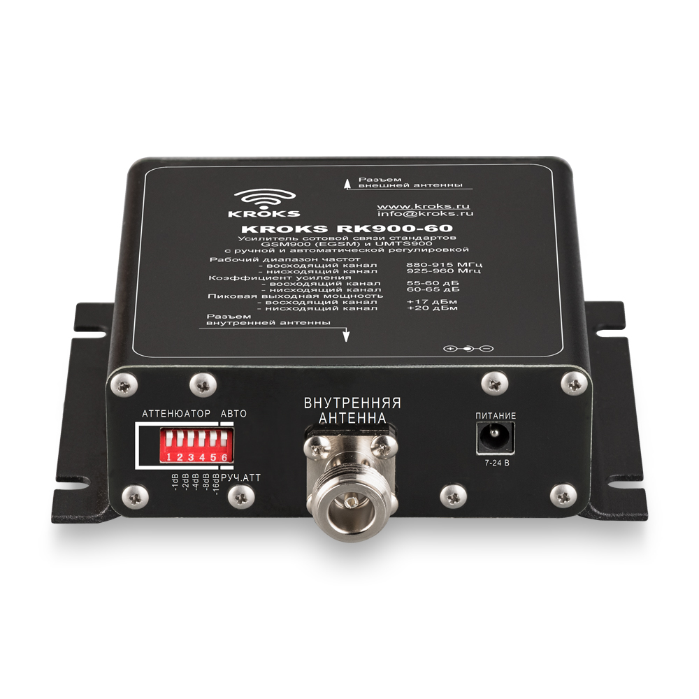 KROKS RK900-60 — репитер, усиливающий стандарты связи GSM900, UMTS(3G)900, LTE900 с коэффициентом усиления 60 дБ и максимальной выходной мощностью 20 дБм (100 мВт).