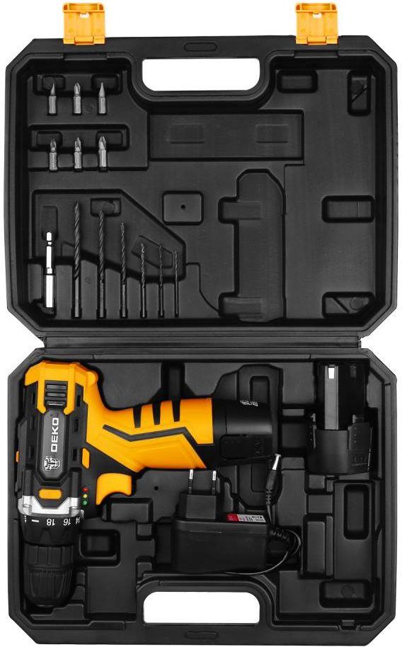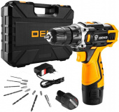 - Комплект поставки: Дрель аккумуляторная, АКБ, зарядное устройство, свёрла: 2; 2,5; 3; 4; 5; 6 мм, биты: SL4,6, PH1,2, PZ1,2 - 6 шт., магнитный держатель бит - 60 мм.