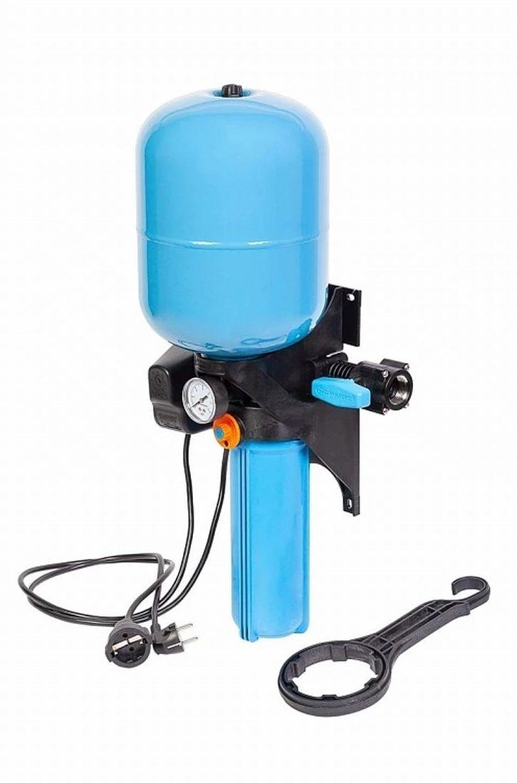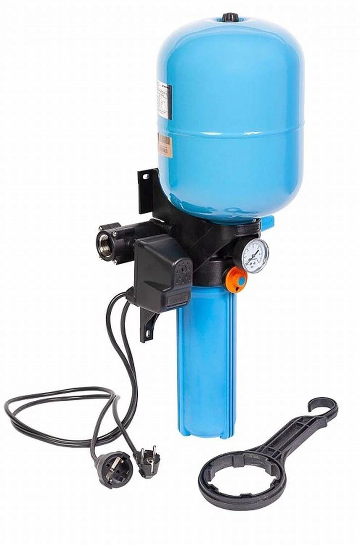 - Комплектация: Реле давления, гидроаккумулятор 10л, колба фильтра, обратный клапан, шаровый кран, манометр, календарь, коллектор, ключ для колбы, вилка, розетка.