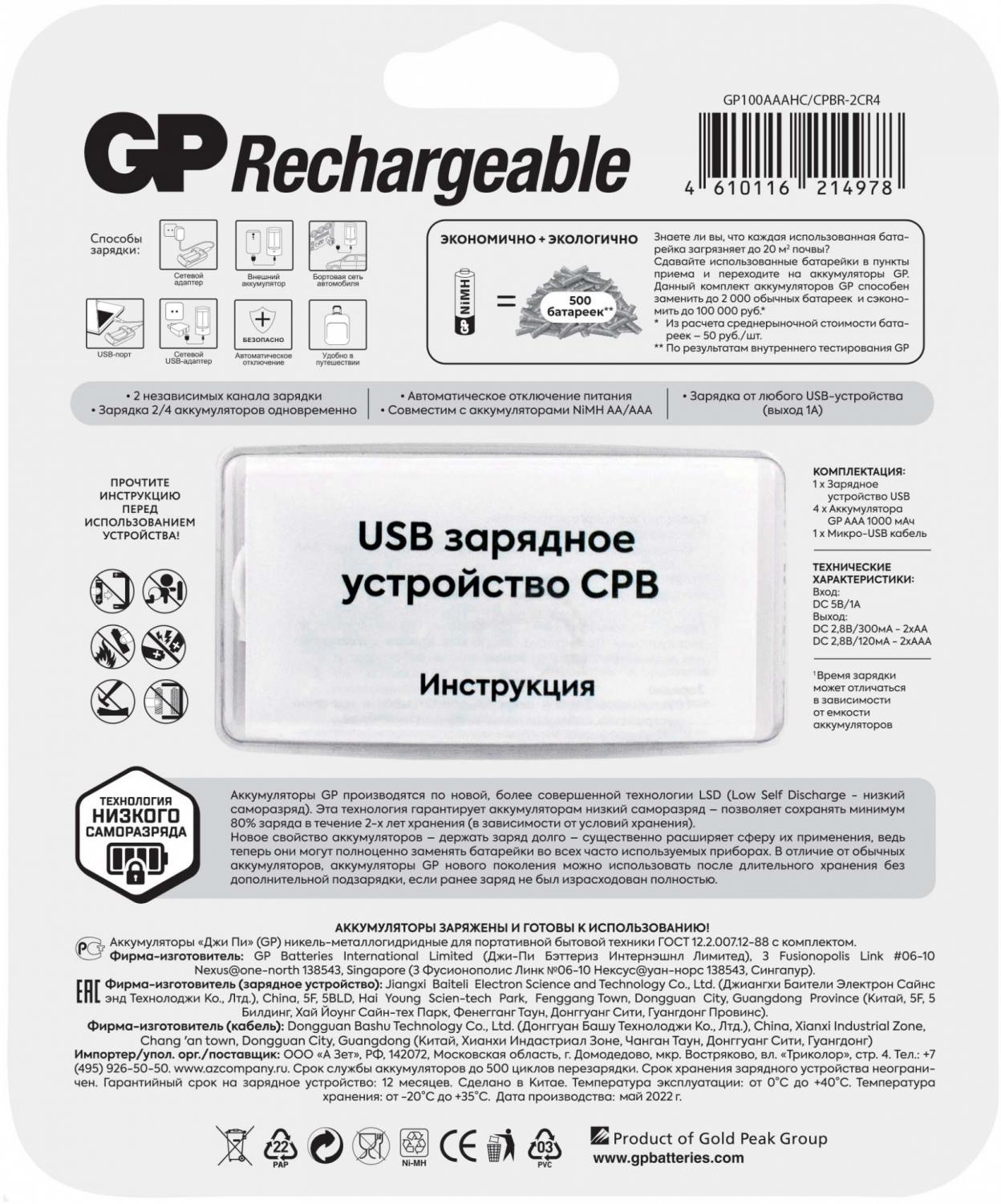 - Дополнительная информация: Время заряда: АА 5-10 ч., ААА 2,5-4 ч. Технология низкого саморазряда