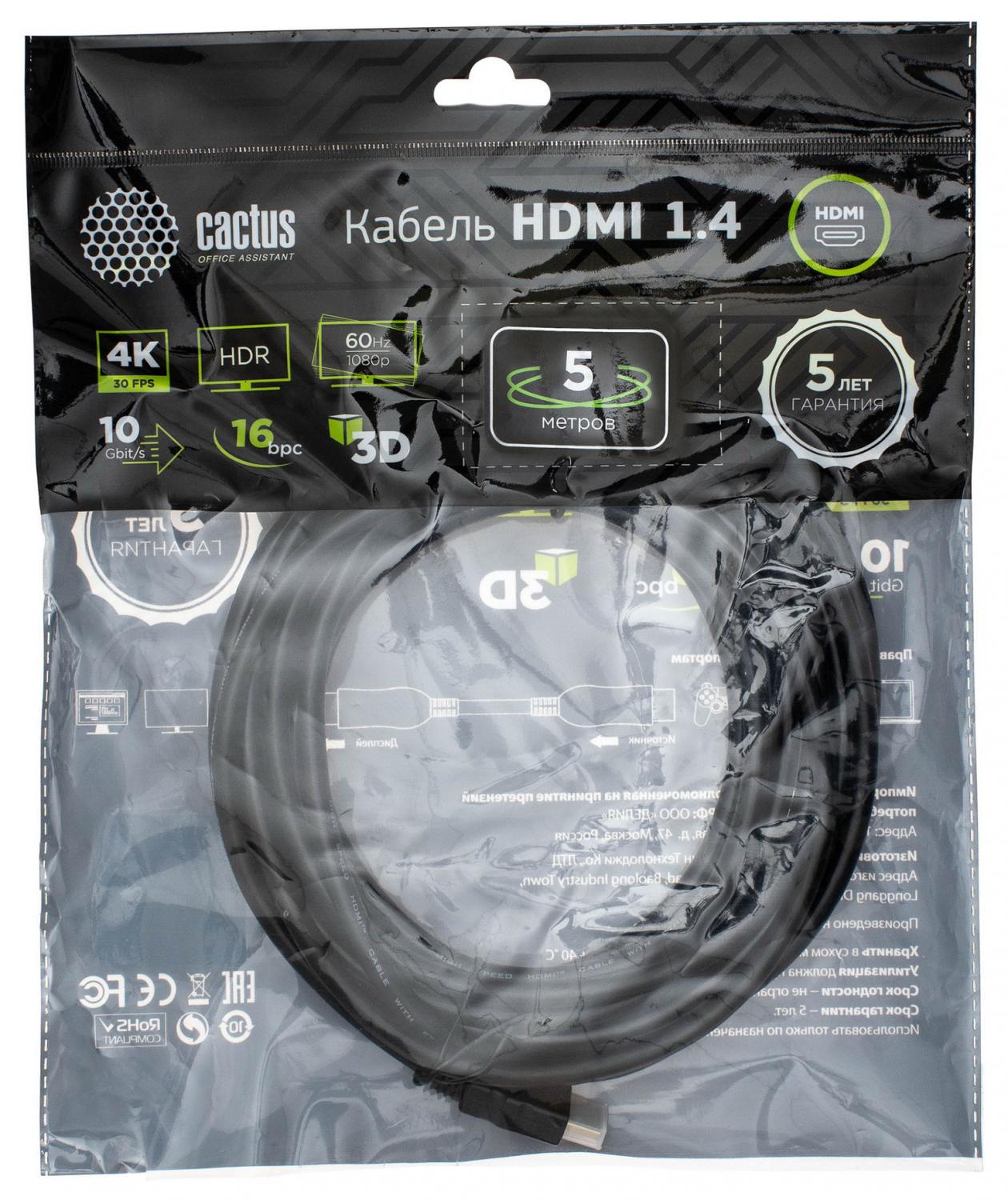Кабель аудио-видео Cactus CS-HDMI.1.4-5 HDMI (m)/HDMI (m) 5м. Позолоченные контакты черный от магазина РЭССИ