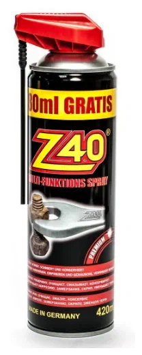 Многофункциональная проникающая смазка Z40: 1 - Позволяет легко отвинчивать ржавые гайки и любые тугие и прикипевшие резьбовые соединения. 2 - Очищает всю тормозную систему от сложного загрязнения и повышает эффективность торможения. 3 - Защищает от коррозии и окисления аккумуляторную клемму, предотвращает короткие замыкания и утечку тока. 4 - Устраняет скрип в трущихся механических узлах автомобиля. Предохраняет резиновые уплотнители от примерзания и растрескивания. 5 - Быстро очищает колёсные диски любых типов от въевшейся грязи и формирует молекулярную защитную пленку на поверхности диска. 6 - Смазывает личинку замка зажигания и обеспечивает комфортный запуск автомобиля. 7 - Предотвращает замерзание и придает водоотталкивающие и влагоотталкивающие свойства. 8 - Устраняет скрип и предотвращает формирование ржавчины в дверных петлях. 9 - Смазывает и защищает рабочие механизмы газонокосилок, бензопил от коррозии, обеспечивая им долговечную работу. 10 - Удаляет известковый налёт и освобождает закисшие части смесителей, душ и т. д. 11 - Смазывает и обеспечивает бесперебойную работу садовой техники (кусторез, культиватор). 12 - Эффективно очищает садовый инвентарь от грязи, масляных пятен, следов травы и консервирует их. 13 - Смазывает детали мотоцикла от коррозии и обеспечивает их высококачественную защиту с повышенным сроком действия. 14 - Очищает от грязи, смазывает цепи и другие механические части велосипеда, обеспечивая этим их надежную защиту против трения и износа. 15 - Смазывает металлические части оружия и сводит к минимуму образование нагара после многократной стрельбы. 16 - Защищает электрические механизмы, крепежи катеров и консервирует их вне сезона. 17 - Смазывает и обеспечивает надежную и долговременную работу бытовых инструментов. 18 - Предохраняет контакты, разъемы от окисления в электрических устройствах, обеспечивая им надежную защиту.