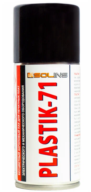 PLASTIK—71 изготовлен на основе акриловой смолы, идеально удовлетворяет требованиям микроэлектроники. Лак содержит флуоресцирующую добавку для контроля равномерности (сплошности) нанесения пленки лака на поверхность печатной платы. Контроль осуществляется освещением платы ультрафиолетовыми лампами. Так называемыми «лампами черного cвета» (Black light). ПЛАСТИК 71 превосходно защищает печатные платы, электронные компоненты, провода и кабели, от выхода из строя из-за неблагоприятных факторов среды