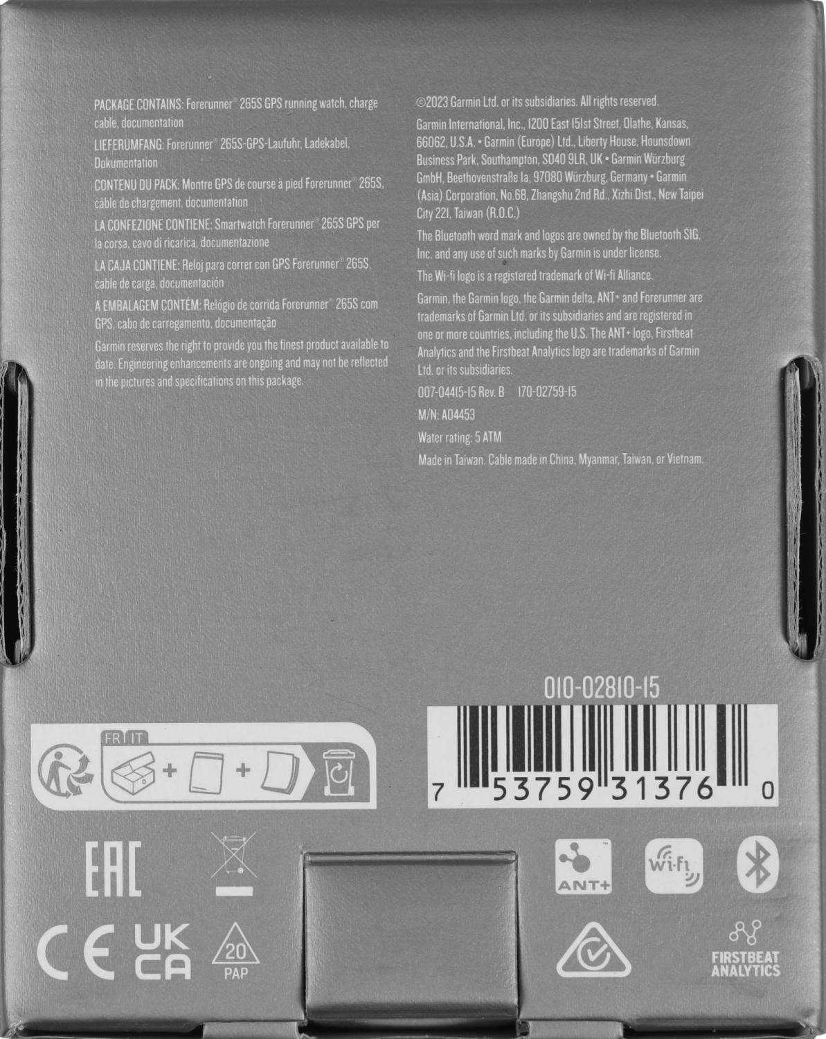- Комплект поставки: Часы forerunner 265S, Кабель зарядки, Краткая инструкция