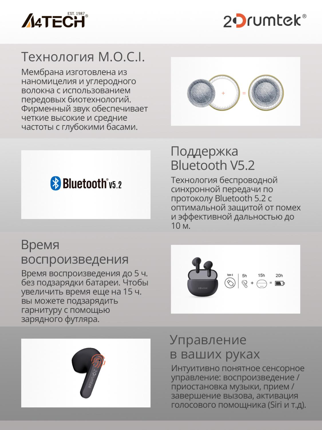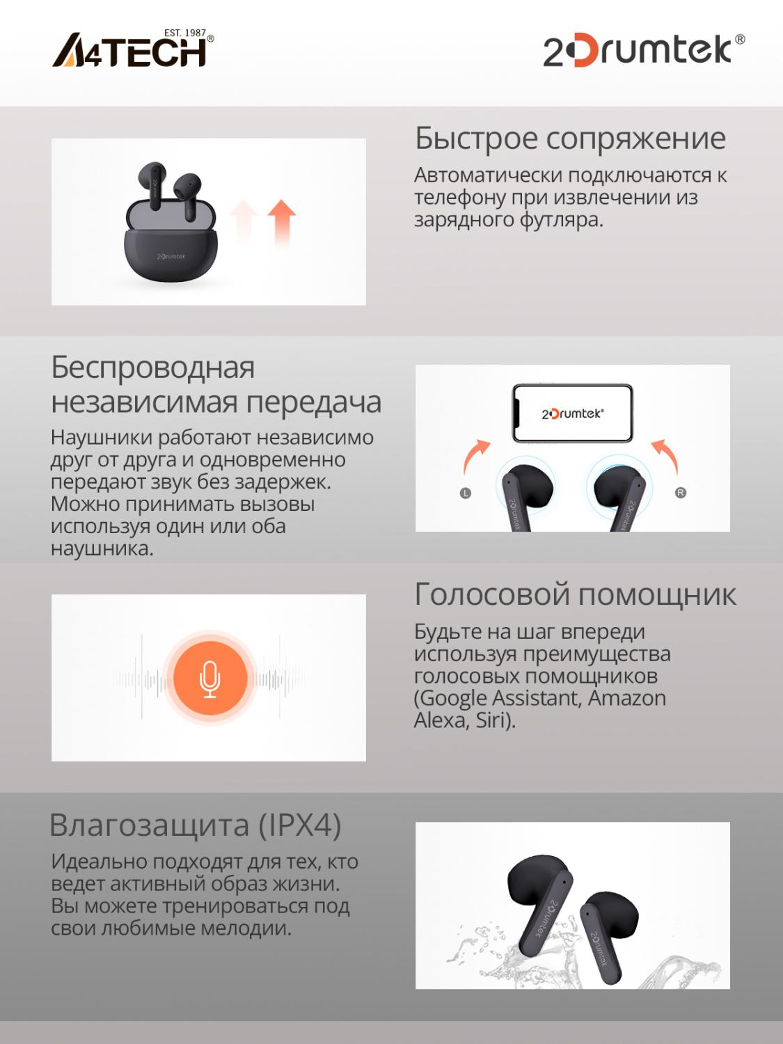 - Особенности: Гибридная мембрана. Быстрое сопряжение. Наушники работают независимо друг от друга и одновременно передают звук без задержек. Влагозащита (IPX4). Идеально подходят для тех, кто ведет активный образ жизни.
