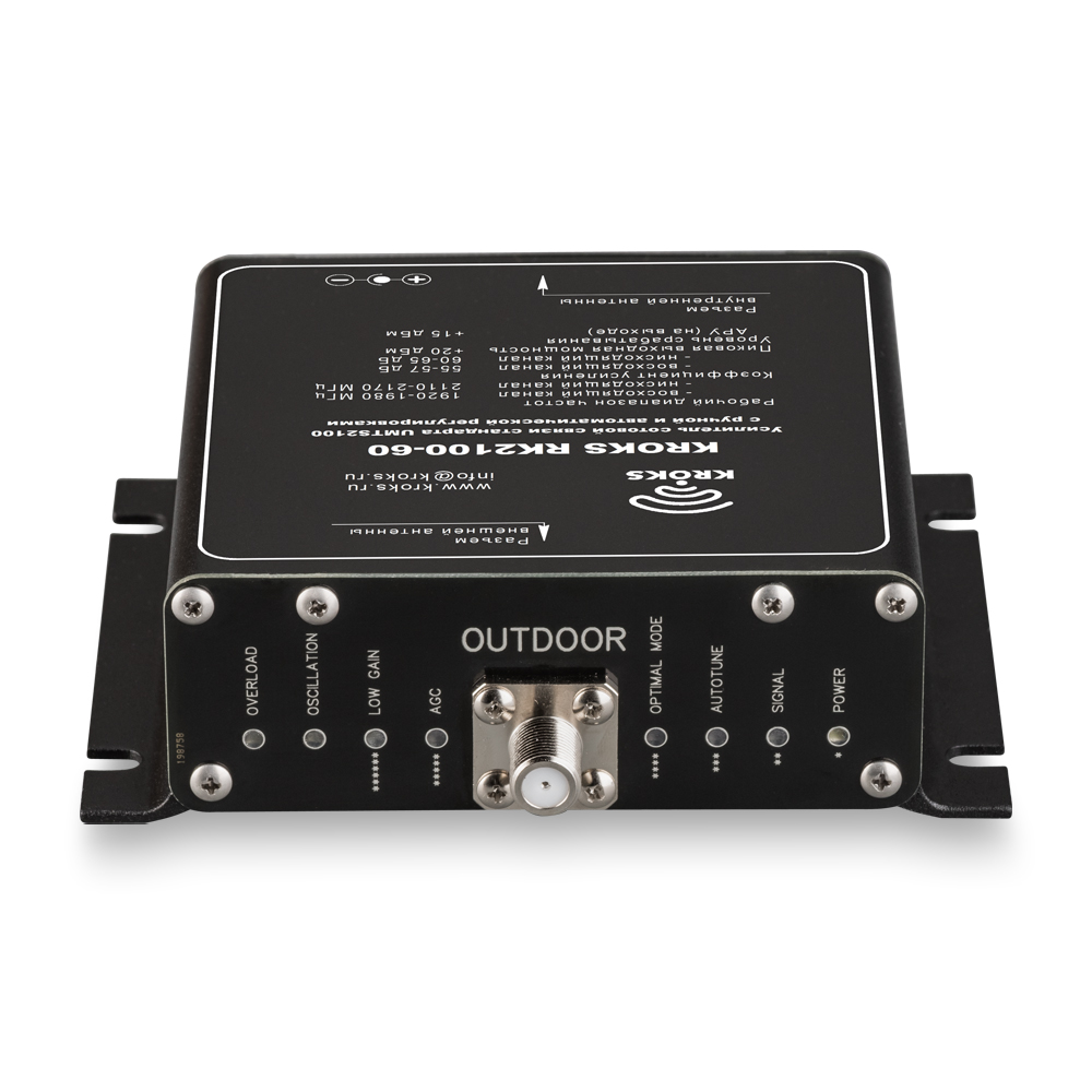 KROKS RK2100-60 — репитер 3G-сигнала с коэффициентом усиления 60 дБ и максимальной выходной мощностью 20 дБм (100 мВт).