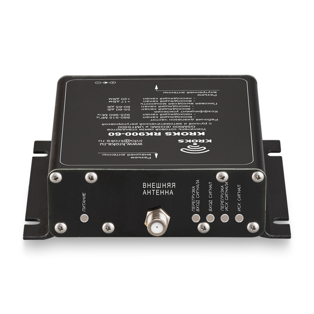 KROKS RK900-60 — репитер, усиливающий стандарты связи GSM900, UMTS(3G)900, LTE900 с коэффициентом усиления 60 дБ и максимальной выходной мощностью 20 дБм (100 мВт).
