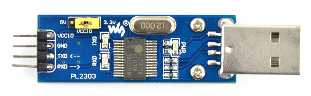 Плата преобразователя интерфейса USB-UART на базе конвертера PL2303 с разъемом USB-A. На плате установлены три светодиода для индикации сигналов TXD, RXD и наличия питания. С помощью джампера можно выбрать выходной уровень напряжения питания 3.3В или 5В.