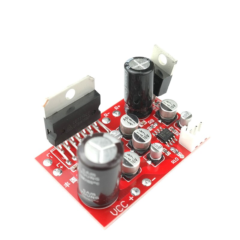 Плата аудио стерео усилителя построена из двух микросхем с минимальной необходимой обвязкой: предварительный операционный усилитель AD828 и популярный 4-канальный усилитель мощности TDA7379. Благодаря встроенному высокопроизводительному преобразователю слабого сигнала AD828, к стереофоническому модулю можно беспрепятственно подключать ЦАП, микрофон, звукосниматель, электрогитару и прочие похожие источники аналогового звука. Вход усилителя AD828 оснащён штырьевыми контактами. В комплектацию с модулем прилагается перемычка-джампер, применяемая для замыкания свободного входного канала с общим выводом, если первоисточник звукосигнала монофонический. Регулировка громкости звука на выходе усилителя осуществляется входящим аудиосигналом.