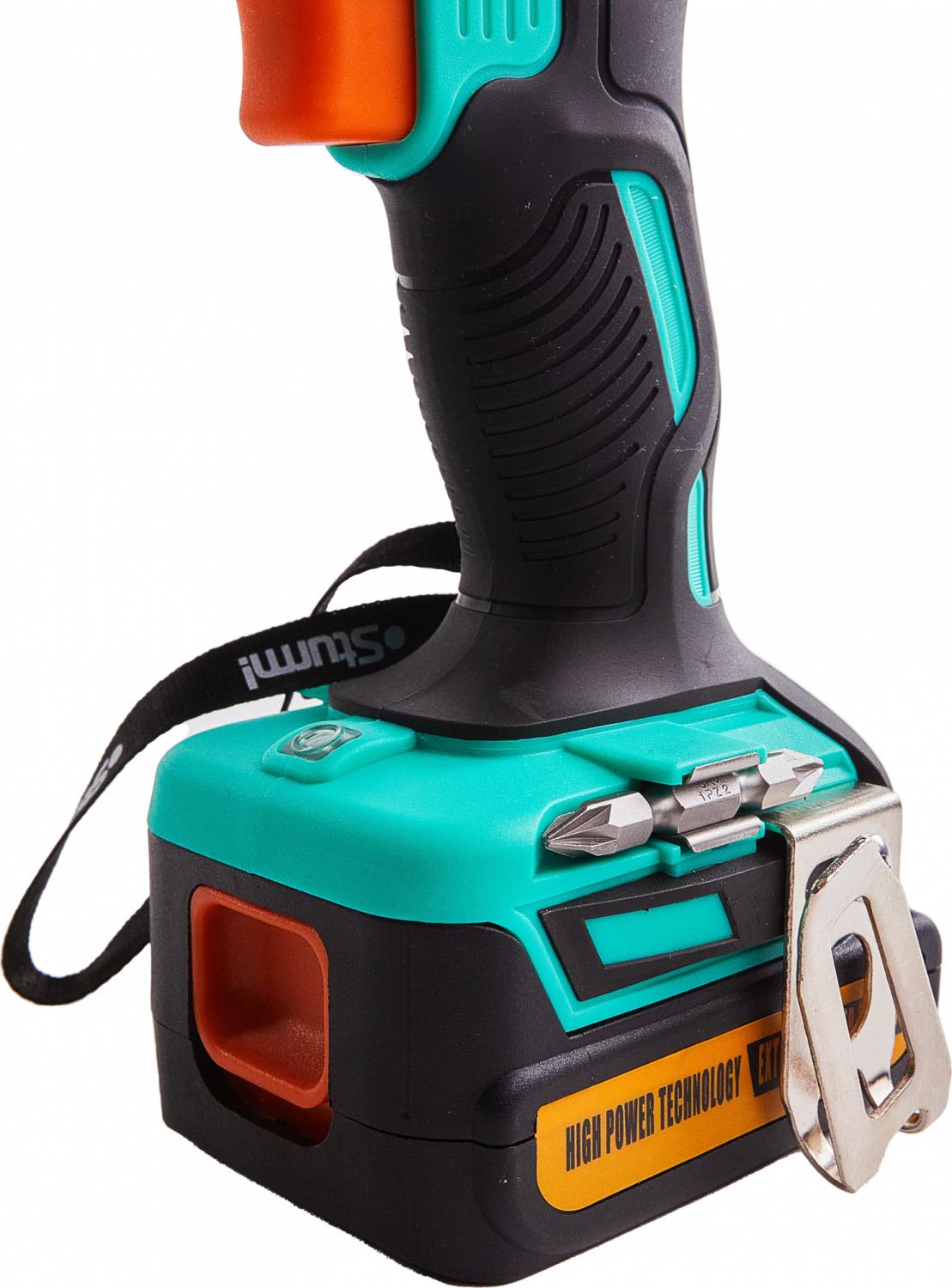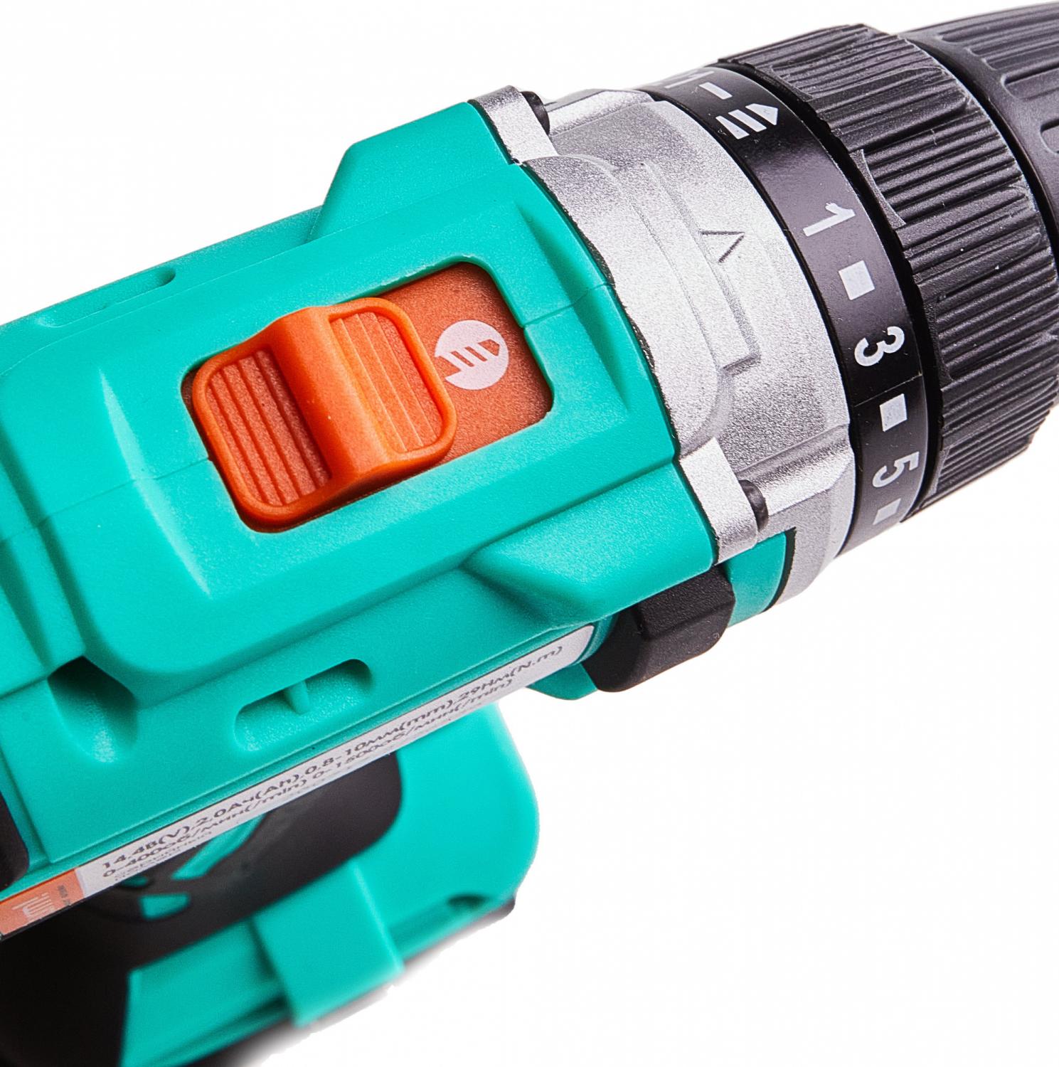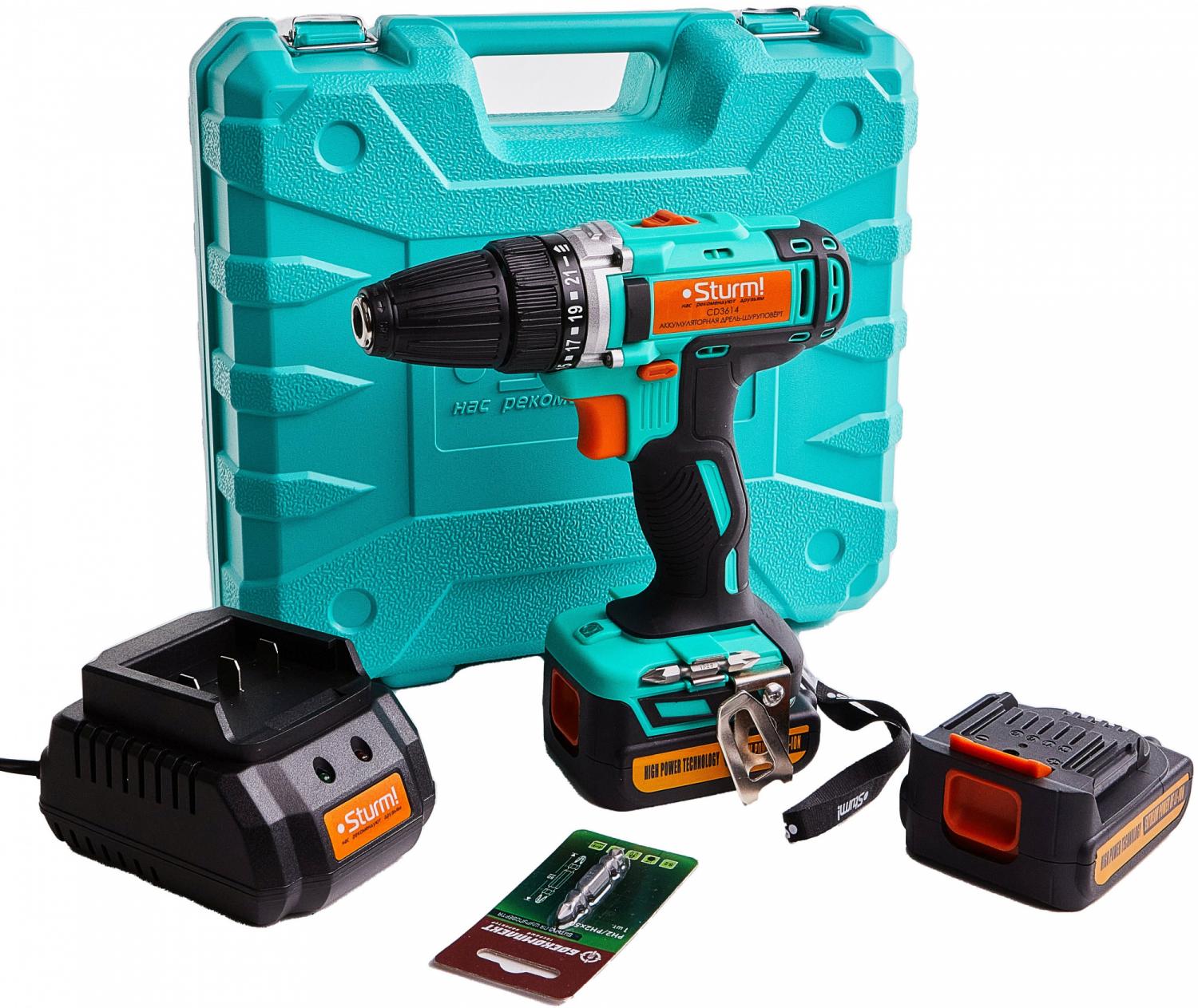 - Комплект поставки: Аккумуляторная дрель-шуруповерт,аккумуляторная батарея (2 шт., одна подсоединена к шуруповерту), зарядное устройство, двусторонняя бита 2 шт., инструкция, кейс.