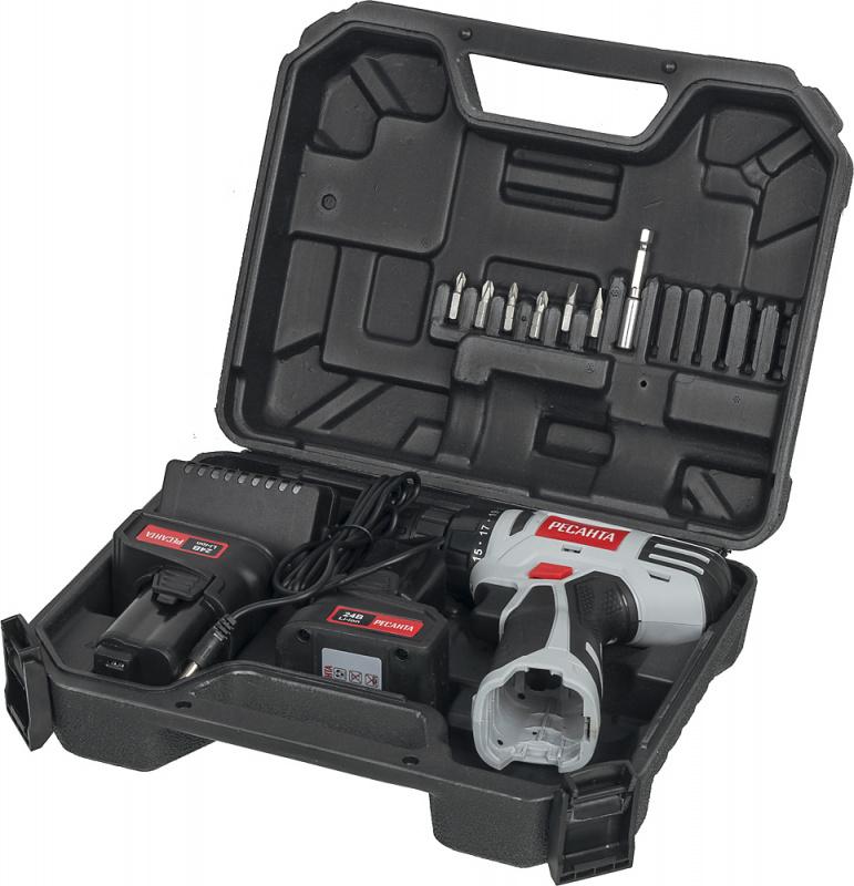- Комплект поставки: Дрель-шуруповерт; аккумулятор - 2шт.; Бита-6шт; Адаптер-удлинитель для бит; Адаптер питания; Кейс