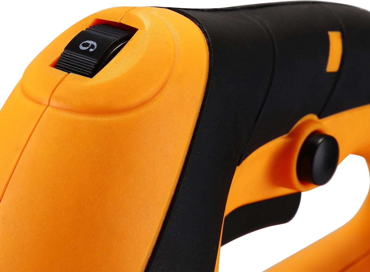 - Особенности: Предусмотрен патрубок для подключения пылесоса, что способствует сохранению чистоты рабочего места. Регулировка оборотов поможет настроить инструмент под конкретную задачу. Лазерный указатель обеспечивает выполнение точных, прямых резов.