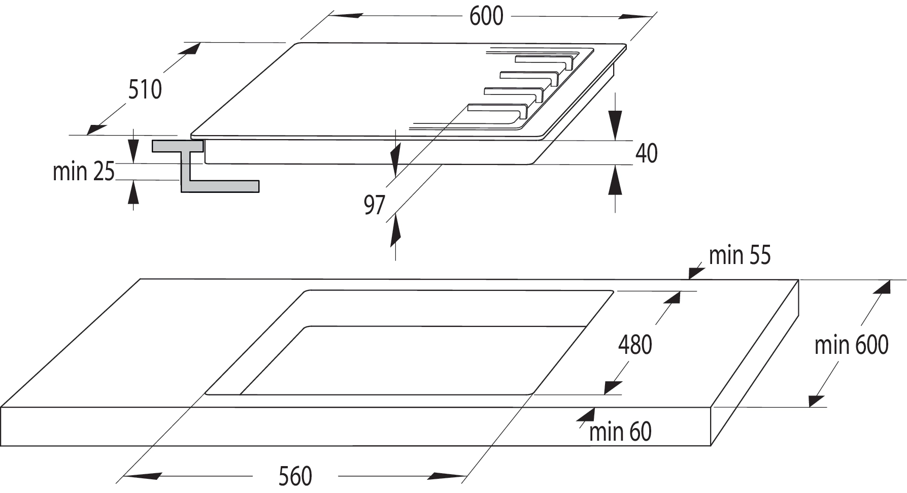 - Размеры для встраивания: 560x480x40мм