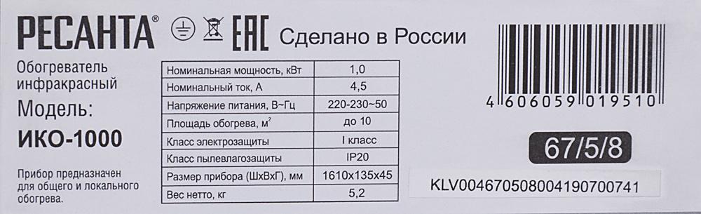 - Класс защищенности обогревателя: IP20