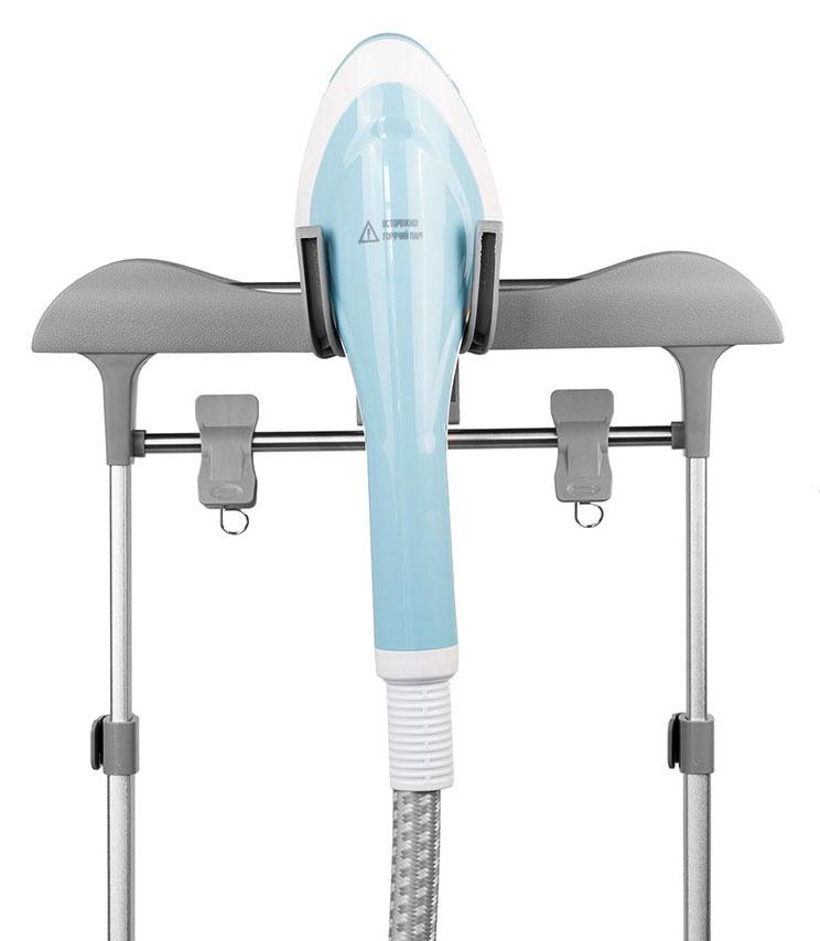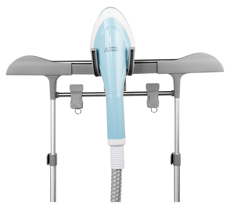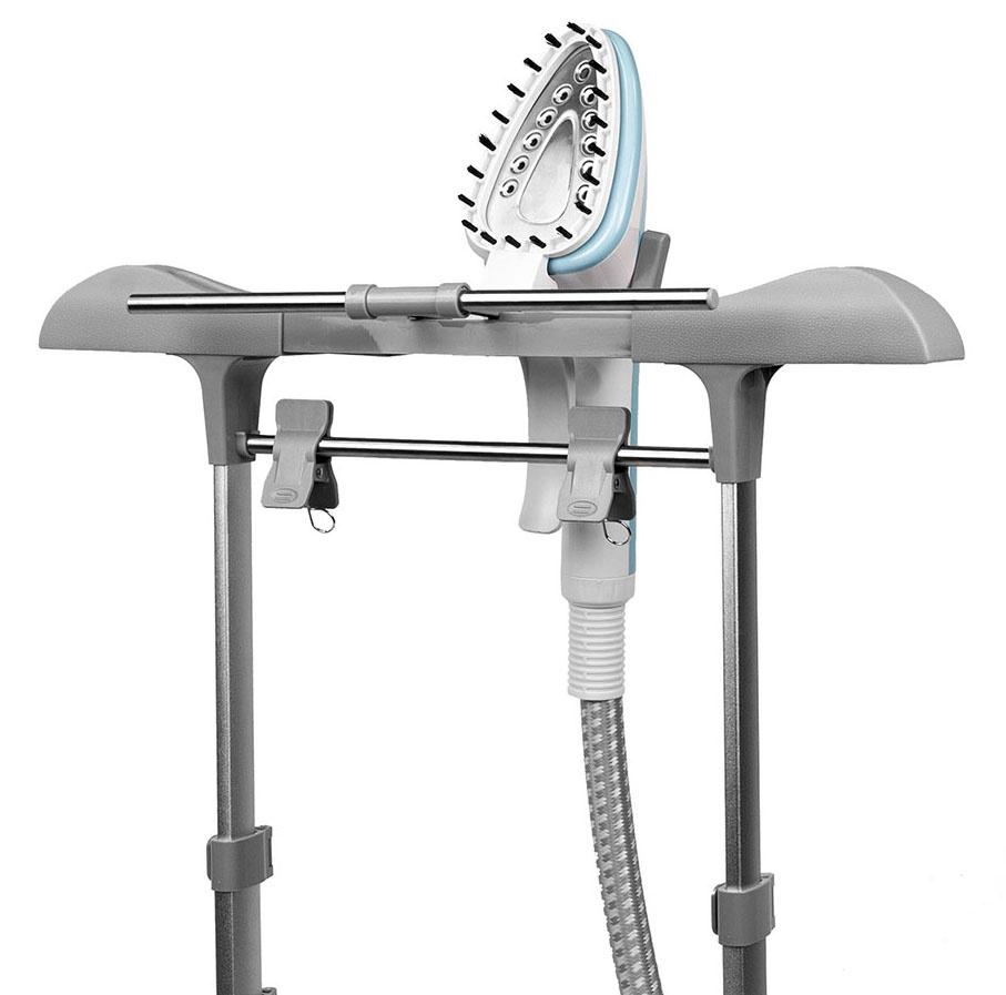 - Особенности: Вешалка, держатели для брюк, подставка для утюжка, теплоизолированная рукавица.