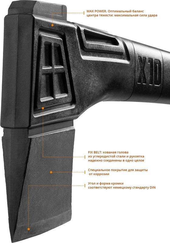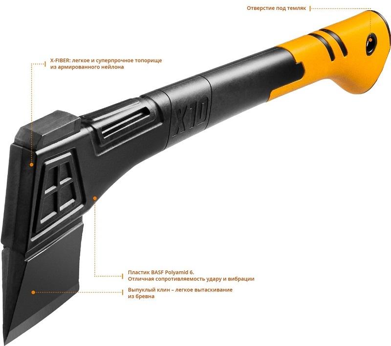 - Описание: X-FIBER: легкое и суперпрочное топорище из армированного нейлона. MAX POWER: Оптимальный баланс центра тяжести: максимальная сила удара. Выпуклый клин для легкого вытаскивания из бревна.