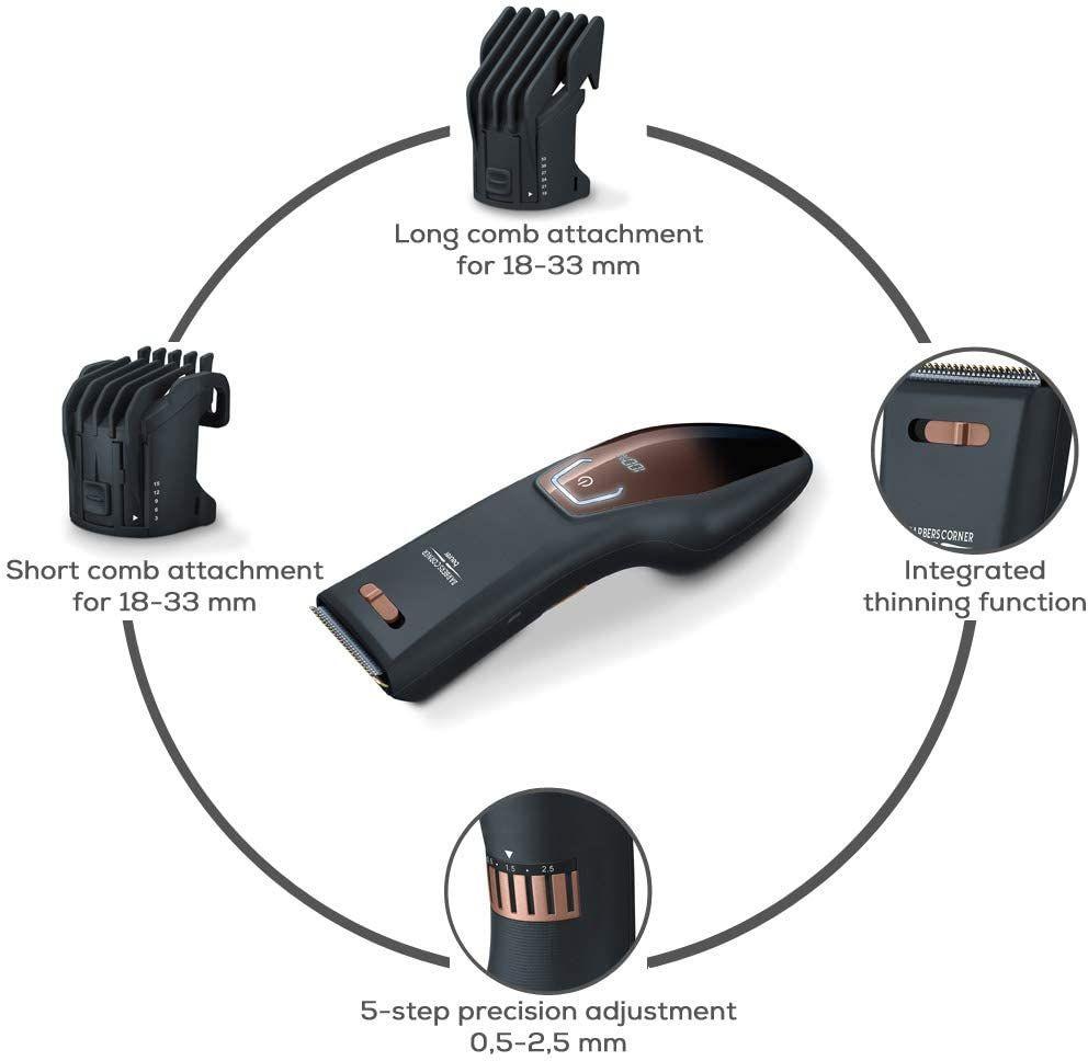 - Насадки: регулируемые по длине насадки-гребни: 3–15 мм и 18–33 мм