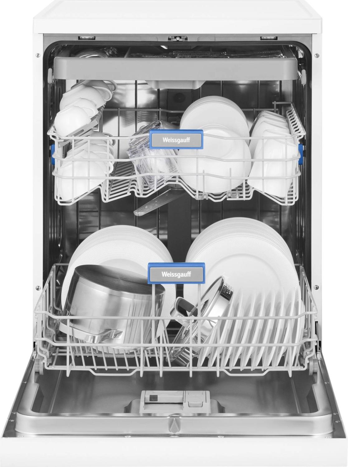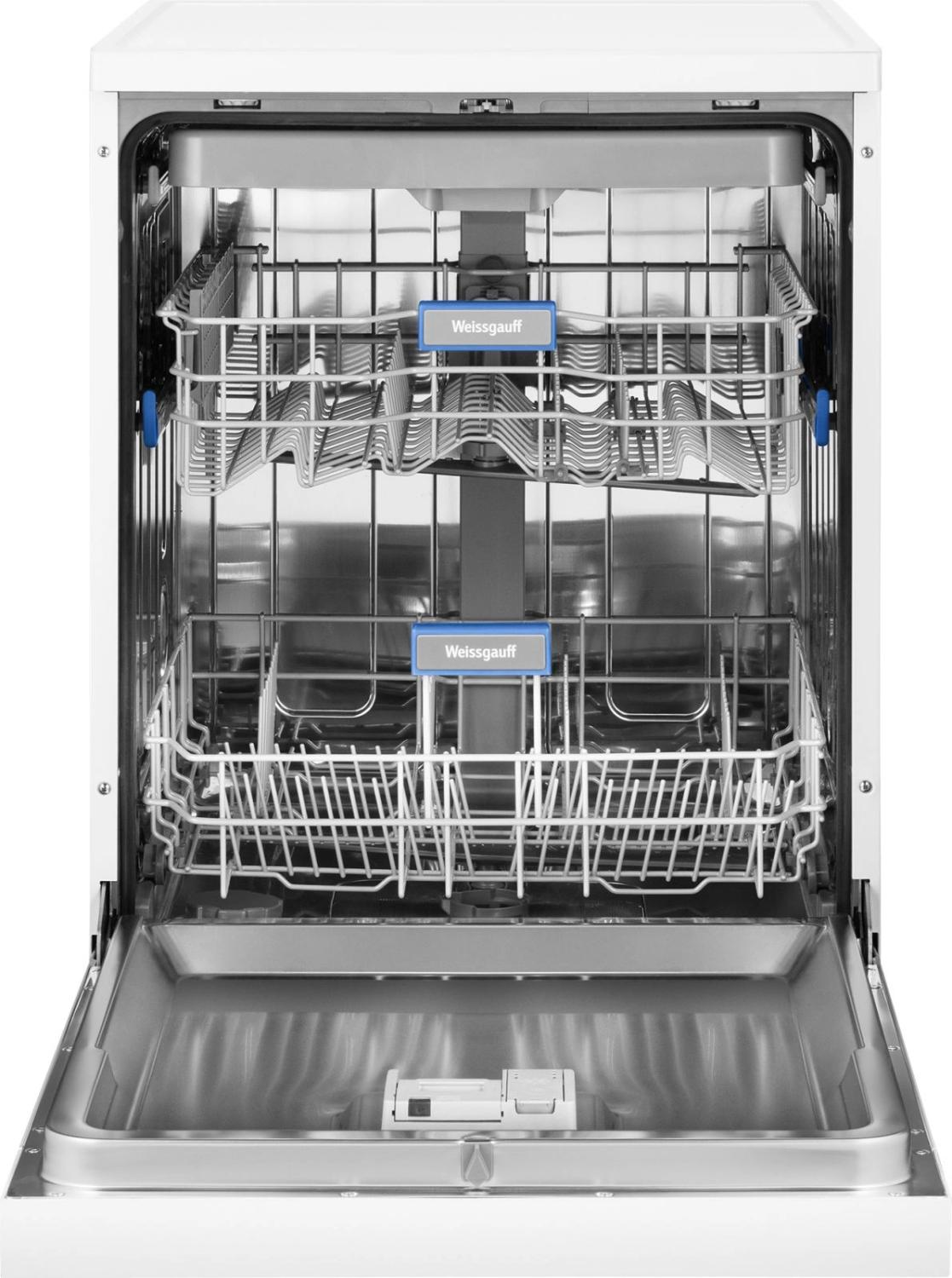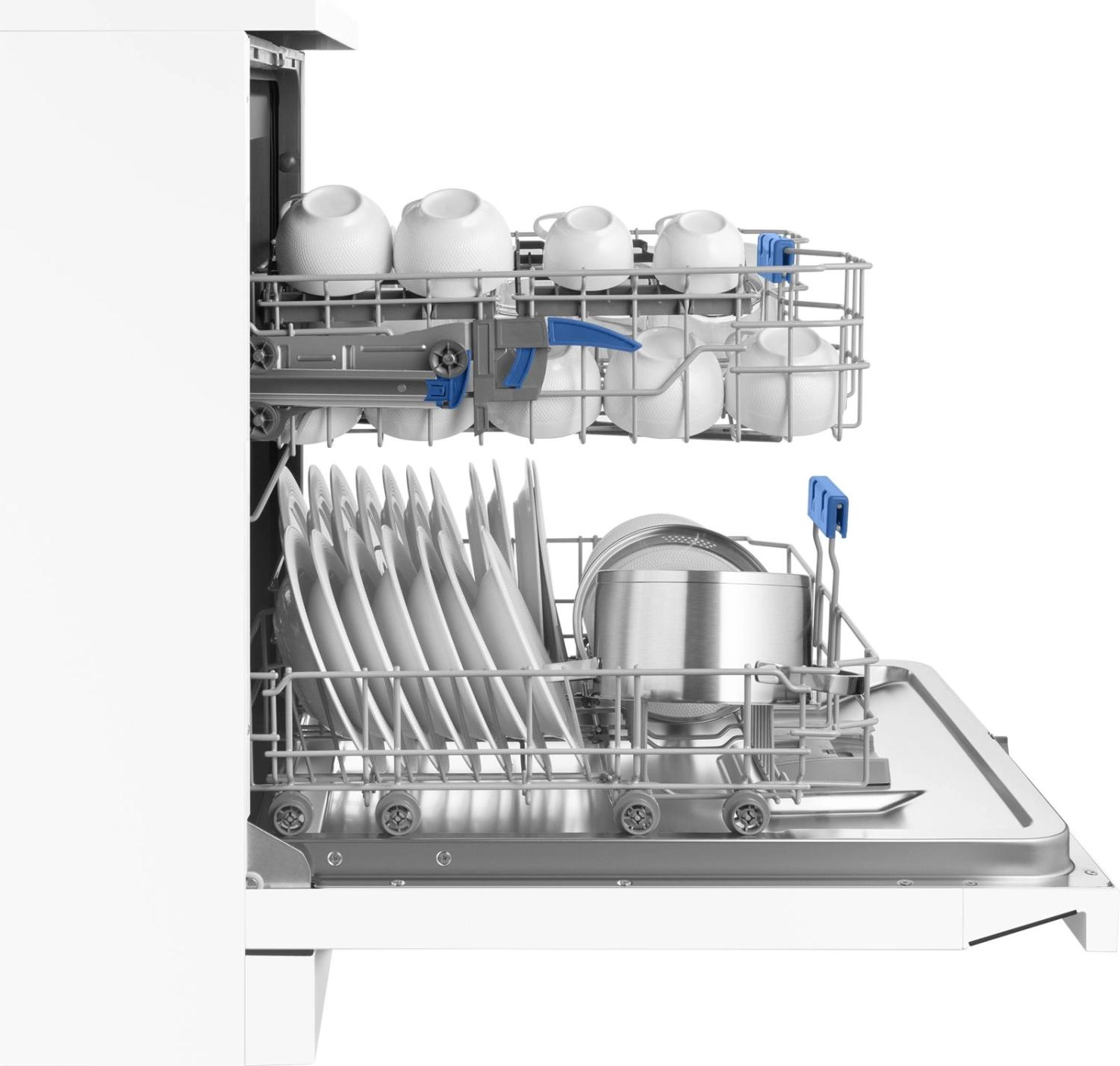 - Внутренняя конструкция: корзина для столовых приборов, полки для кружек, разбрызгиватель над верхней корзиной, регулируемая по высоте корзина для посуды