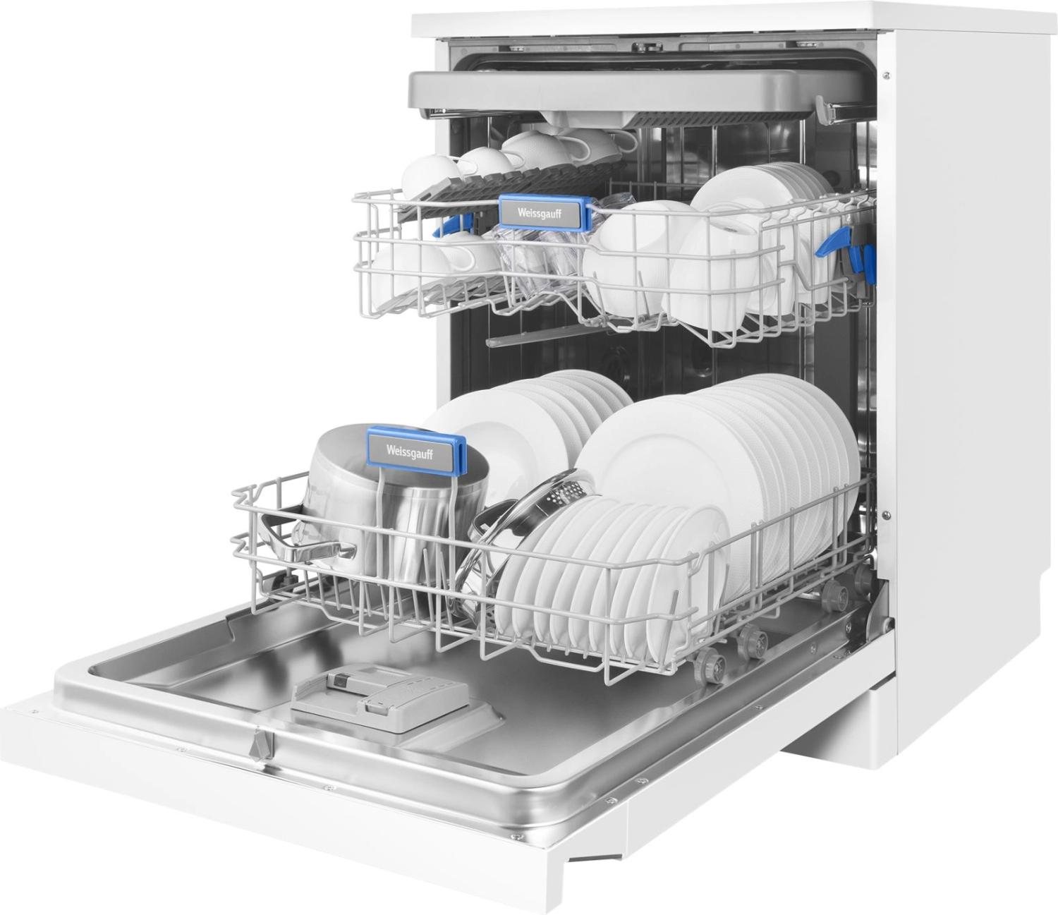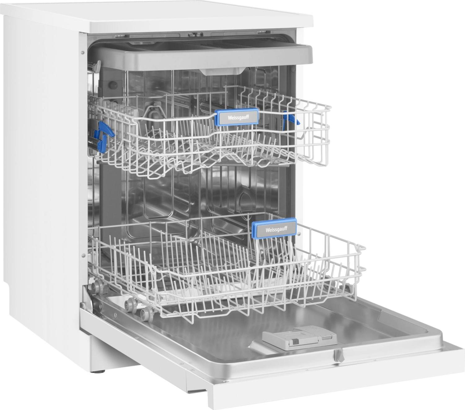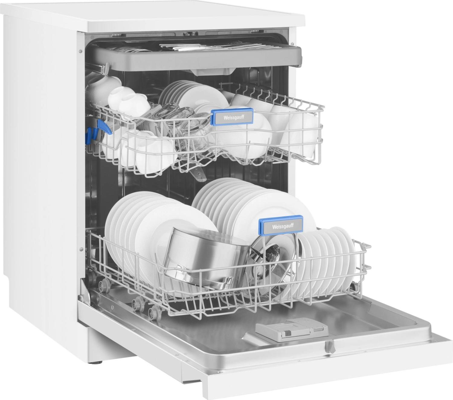 - Внутренняя конструкция: корзина для столовых приборов, полки для кружек, разбрызгиватель над верхней корзиной, регулируемая по высоте корзина для посуды