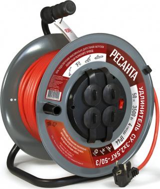 Удлинитель силовой Ресанта СУ-3х2,5КГ-50/3 (61/118/10) 2x1.0кв.мм 4розет. 40м ПВС катушка серый