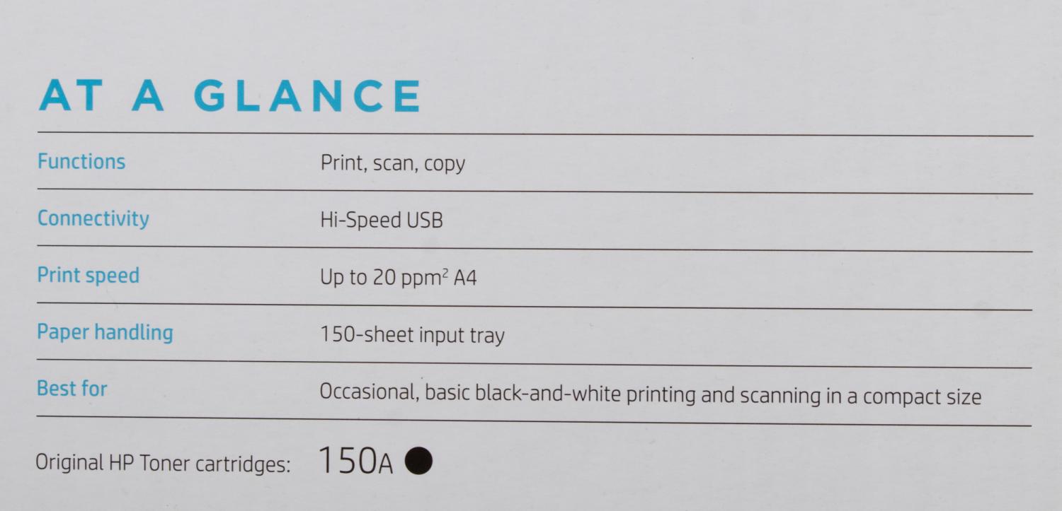 - Расходные материалы: Лазерный картридж HP LaserJet 150A, черный (~975 страниц) W1500A.