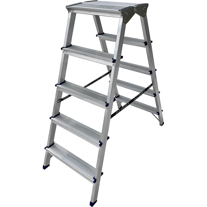 Двухсторонняя алюминиевая стремянка Алюмет c широкой верхней ступенью 260 мм 2х5 ступеней. Серия ADK6205 от магазина РЭССИ
